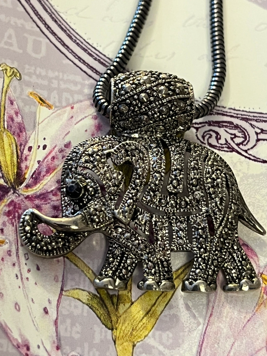 Beautiful vintage marcasite elephant pendant necklace. Features a dark metal chain and intricate detailing. A lovely statement piece.