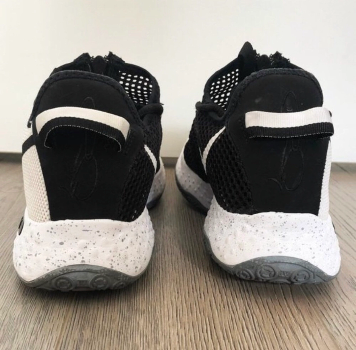 - Black and white breathable mesh upper