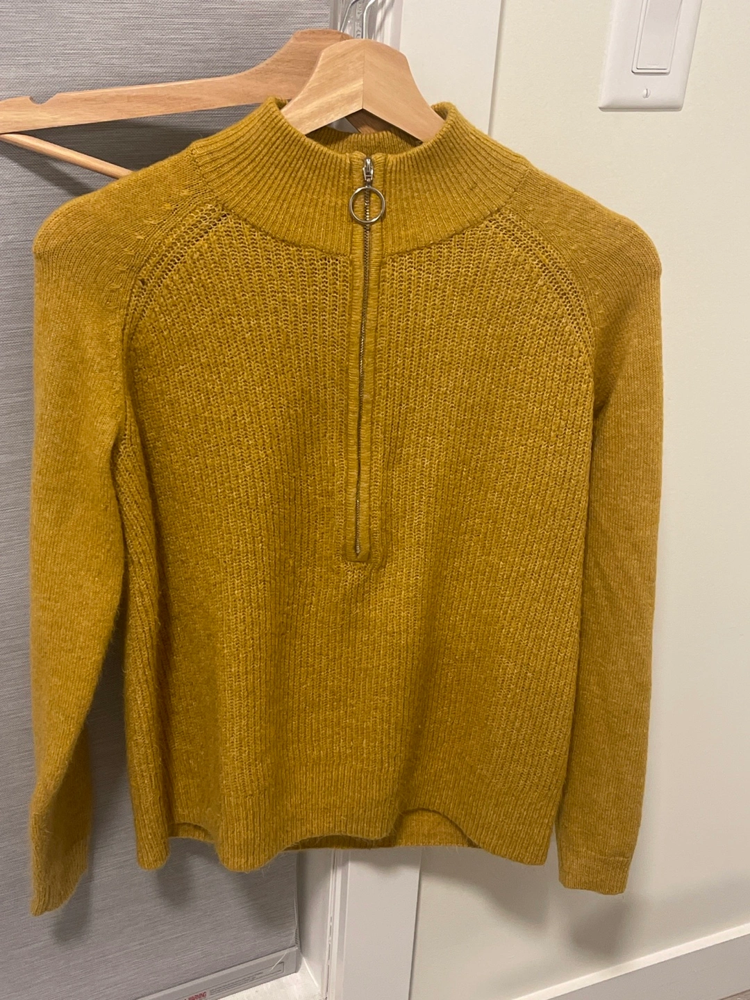 Cozy mustard yellow sweater. Half zip closure. Long sleeves. Relaxed fit. Great for fall and winter.