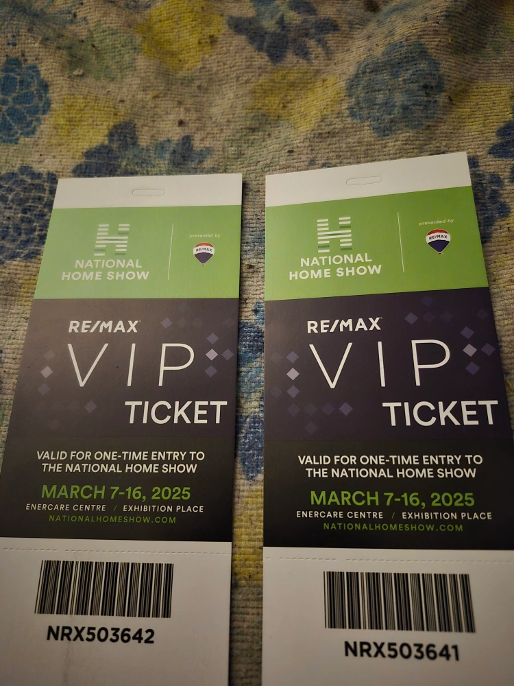 Pair of VIP tickets. Valid for one-time entry March 7-16, 2025. Enercare Centre, Exhibition Place. Includes VIP entrance and complimentary seating at the Main Feature Show. Reserved access to the RE/MAX VIP Lounge. total original price is $40 for both, I would like $20.