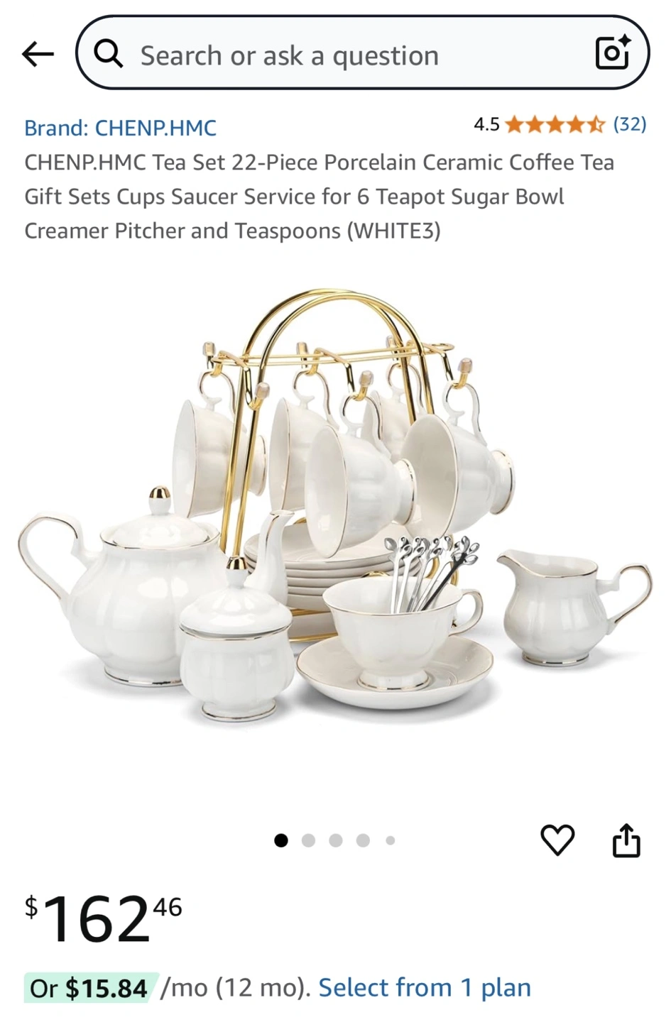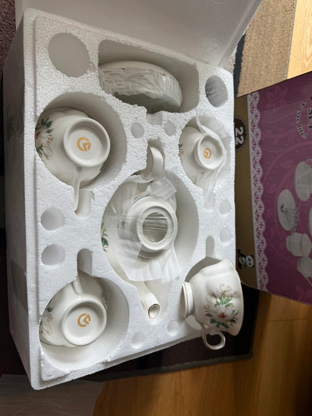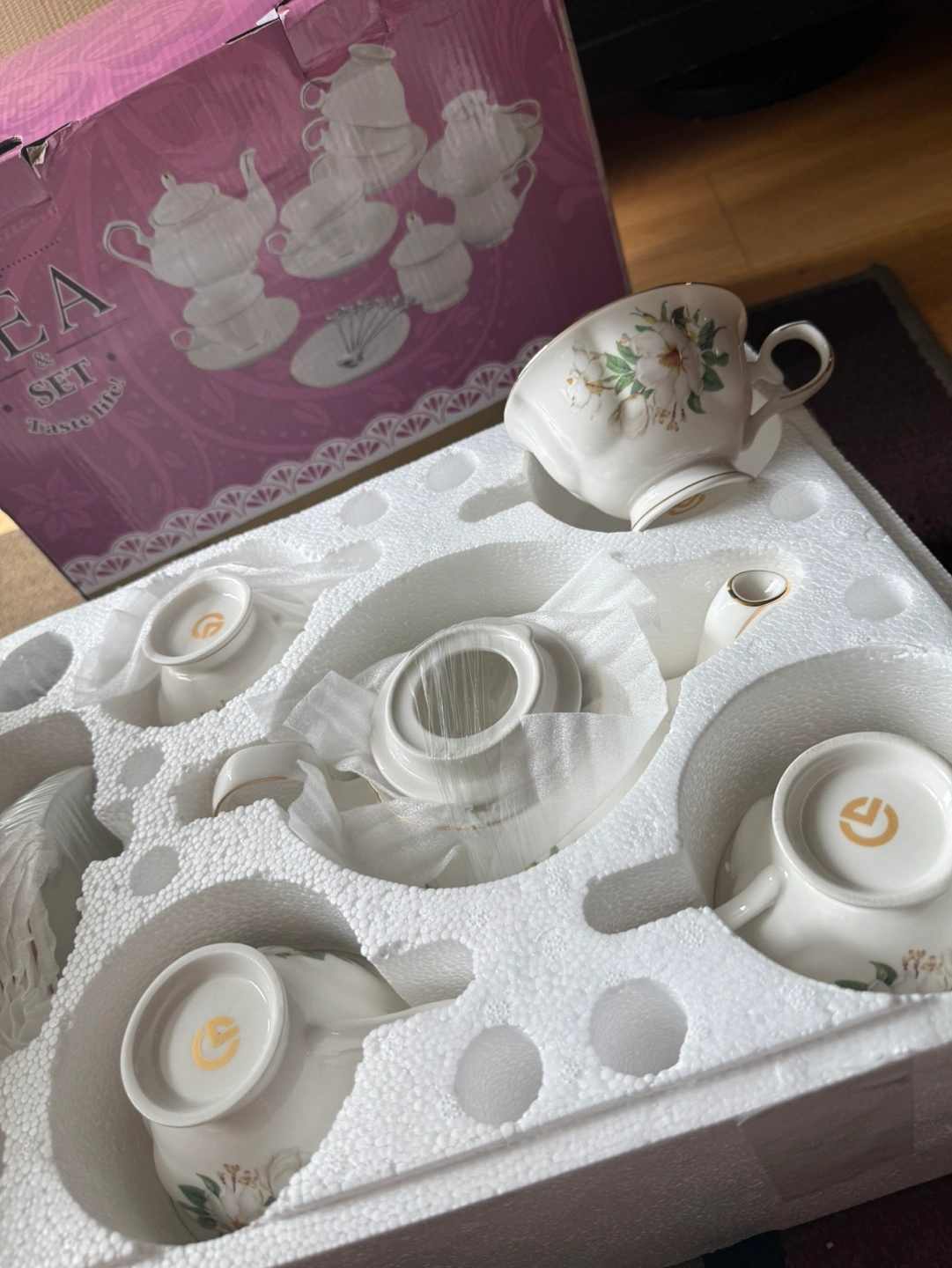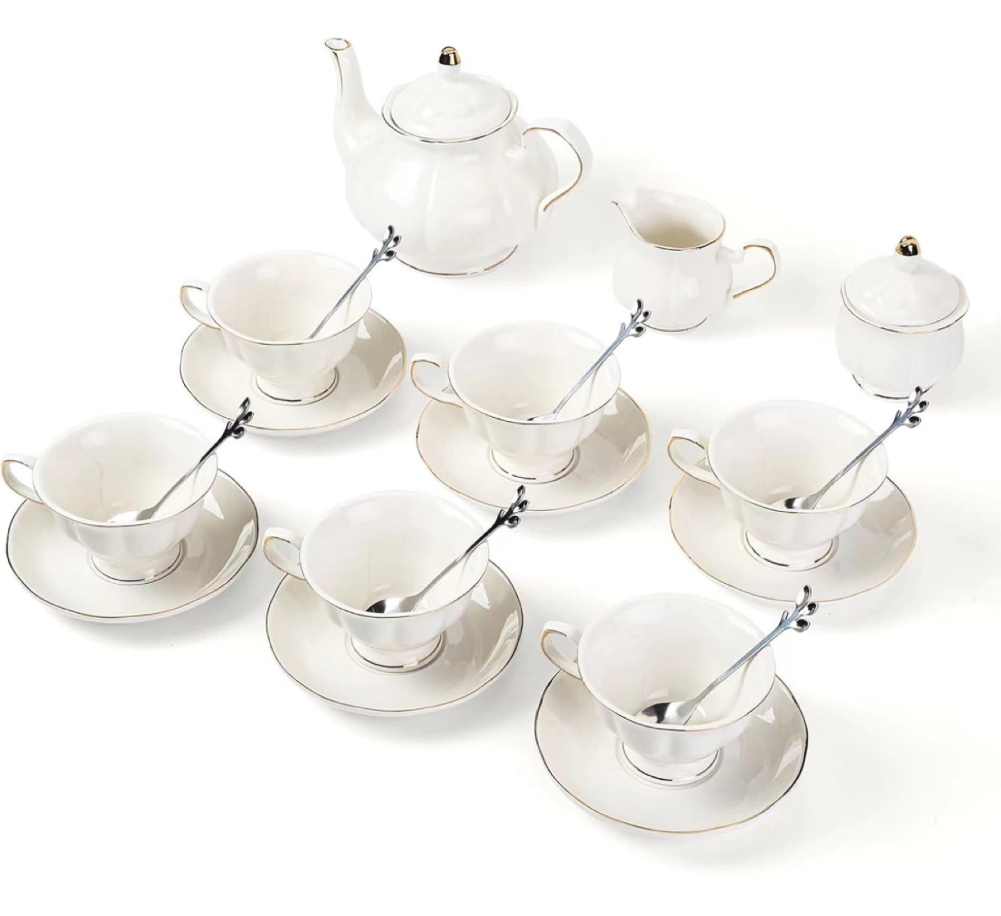 Elegant 22-piece tea set. Includes teapot, creamer, sugar bowl, six teacups, saucers, and teaspoons. White porcelain with gold accents. New in box.