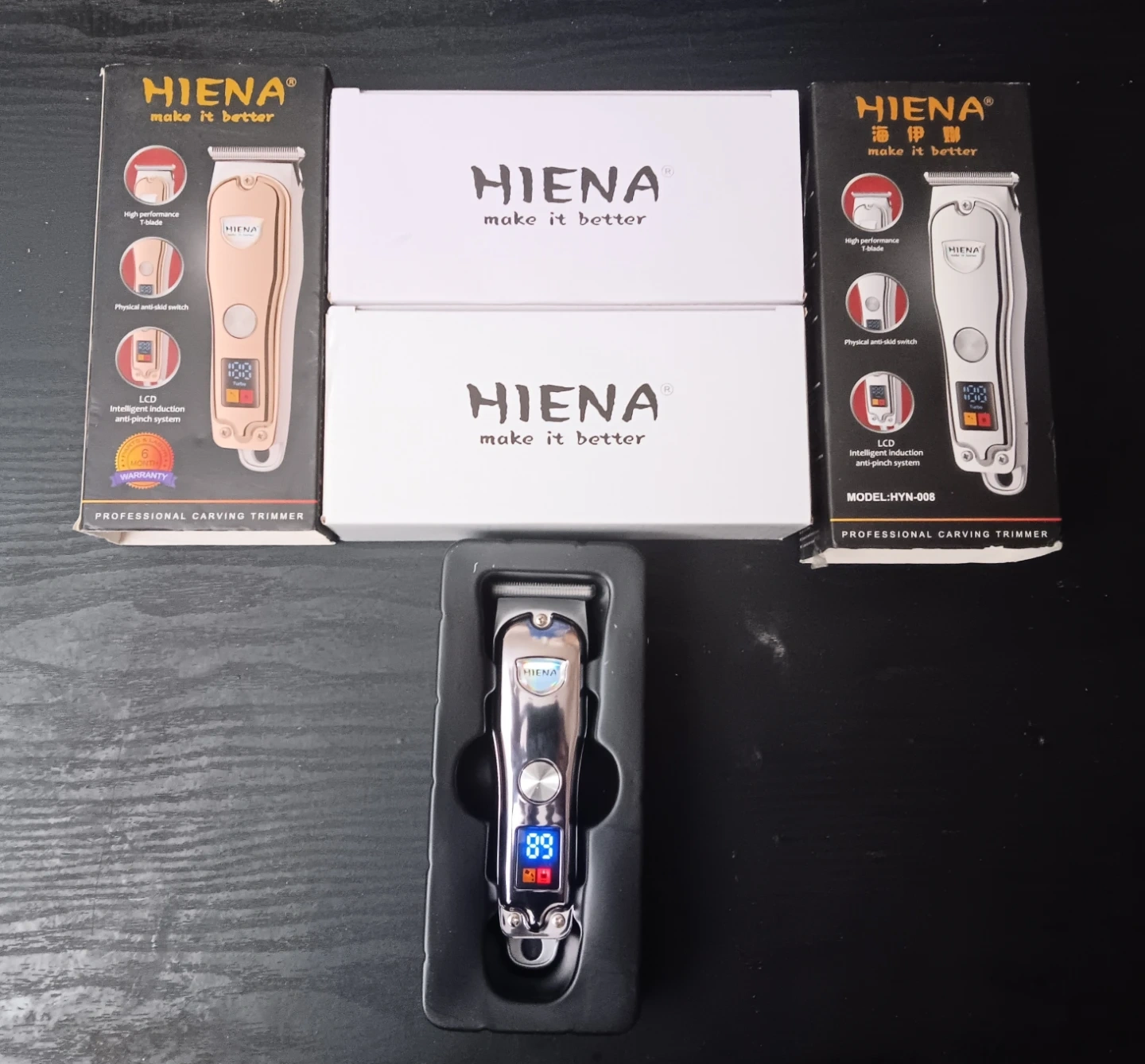 Hiena Cordless Mini Portable pocket size electric style professional hair Trimmer High-performance T-blade. LCD display shows battery life and turbo mode. Anti-skid switch. Intelligent induction anti-pinch system.