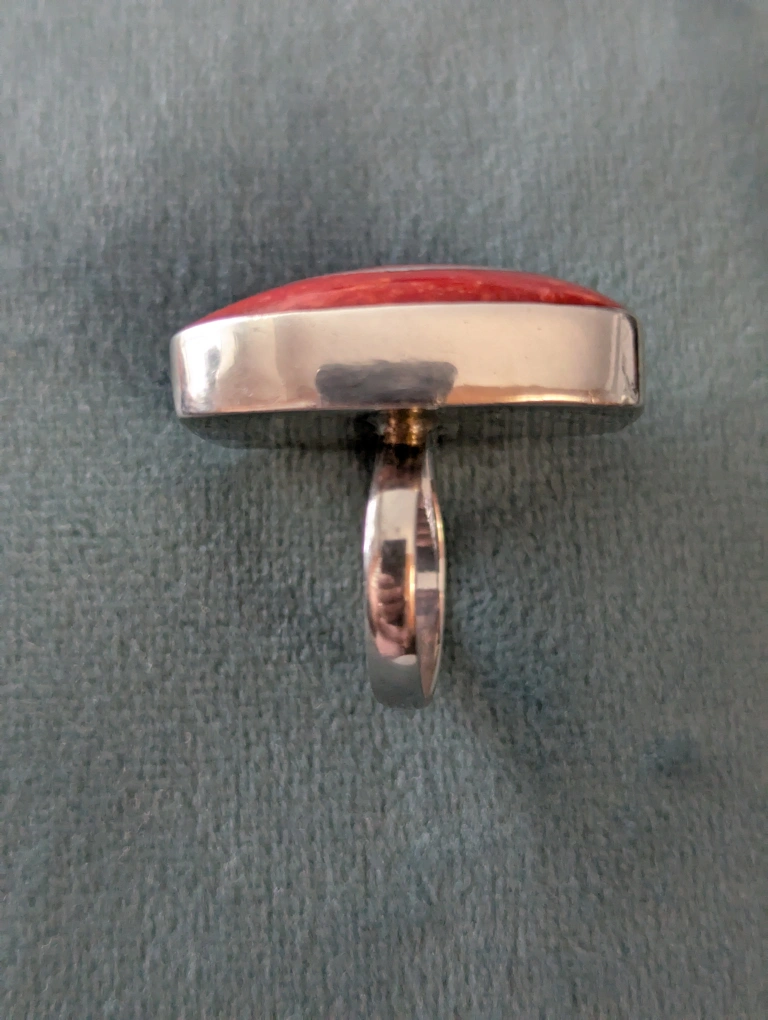 Stunning statement ring. Features a large, red stone with a silver swirl design. Silver band. Eye-catching piece of jewellery.