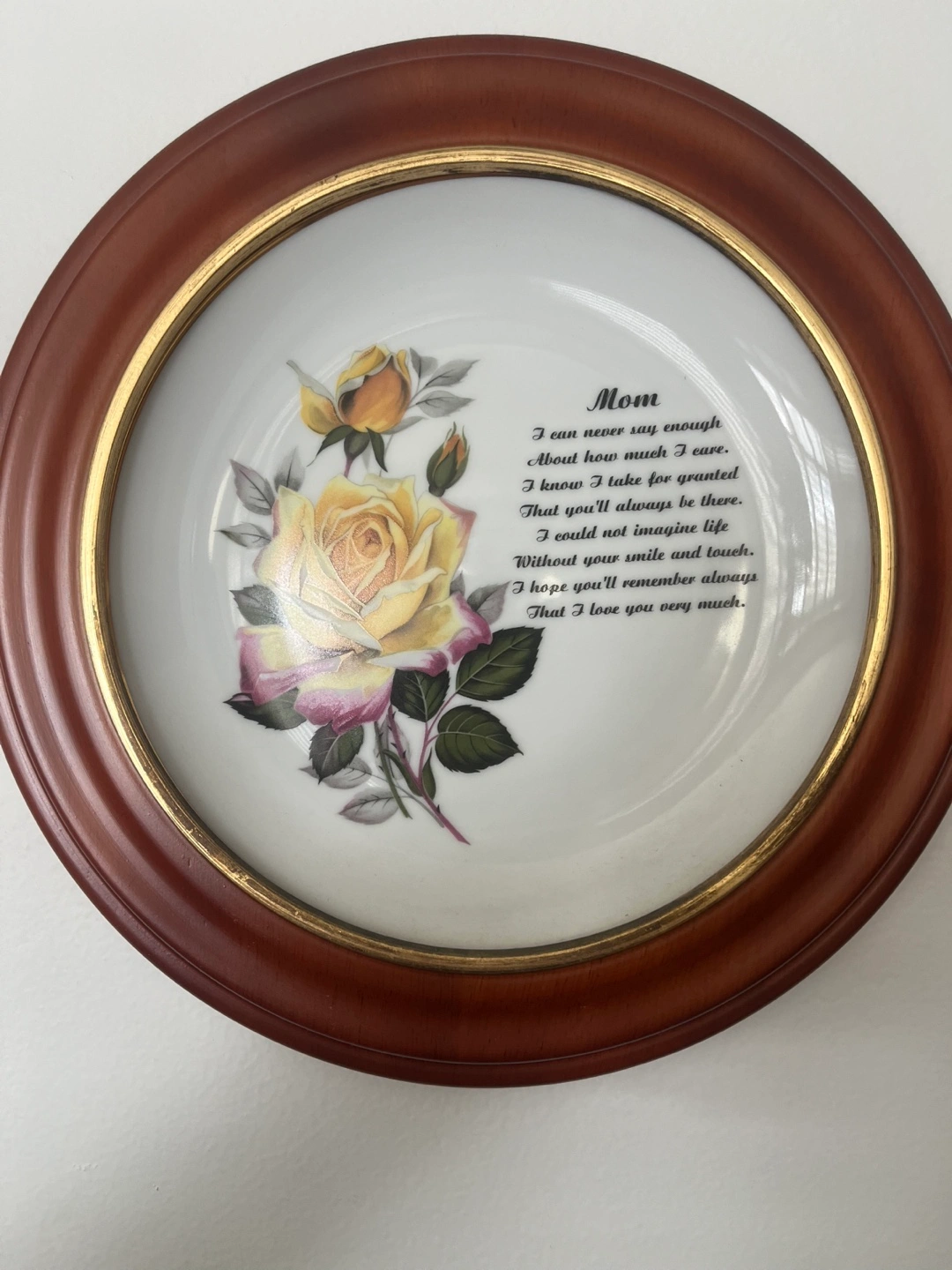 230Beautiful ceramic plate featuring a poem dedicated to Mom. Yellow rose design. Wooden frame included. Wall-hanging hardware attached.