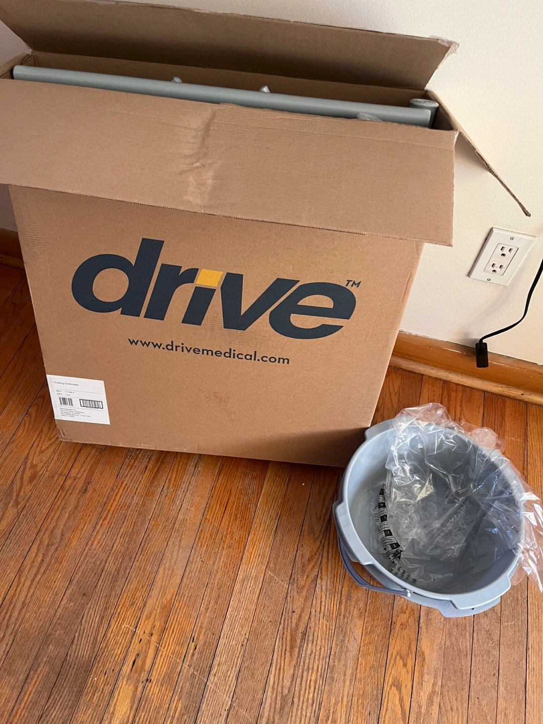 Brand new Drive Medical folding commode. Still in original box. Includes a removable pail. Lightweight and easy to assemble.
