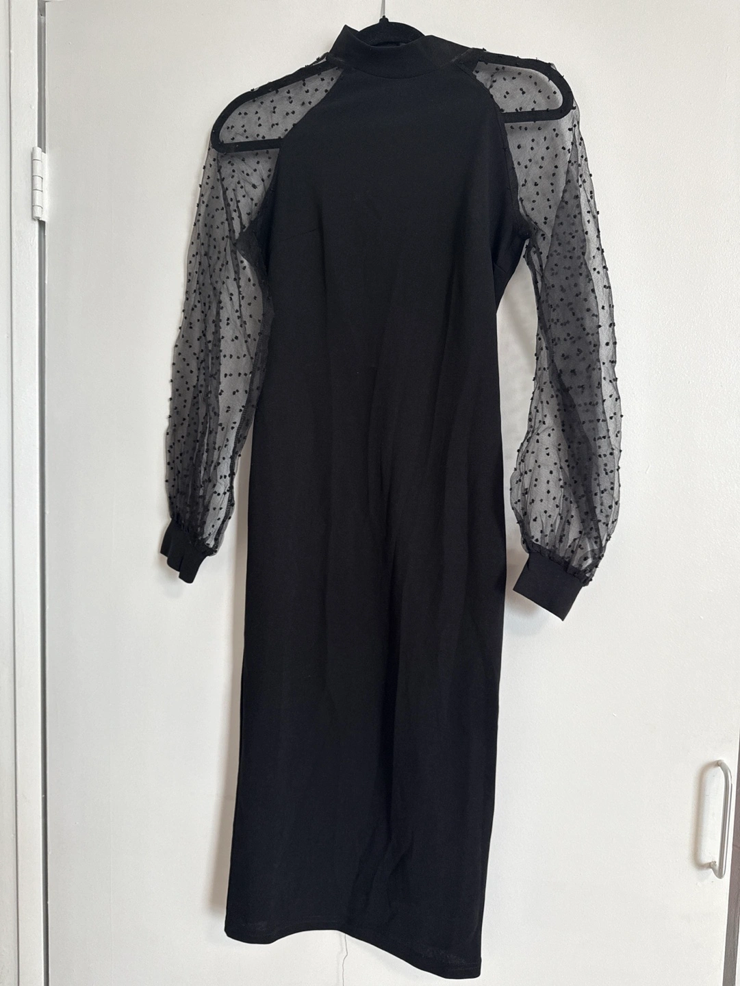 Elegant black midi dress. Features sheer polka dot sleeves and a high neck. Perfect for a night out or special occasion. Long sleeves.