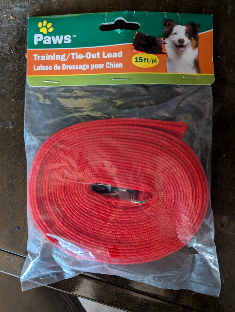 New in package. Red training or tie-out lead for dogs. Measures 15 feet long. Durable nylon material. Great for training or securing your dog. FIRM