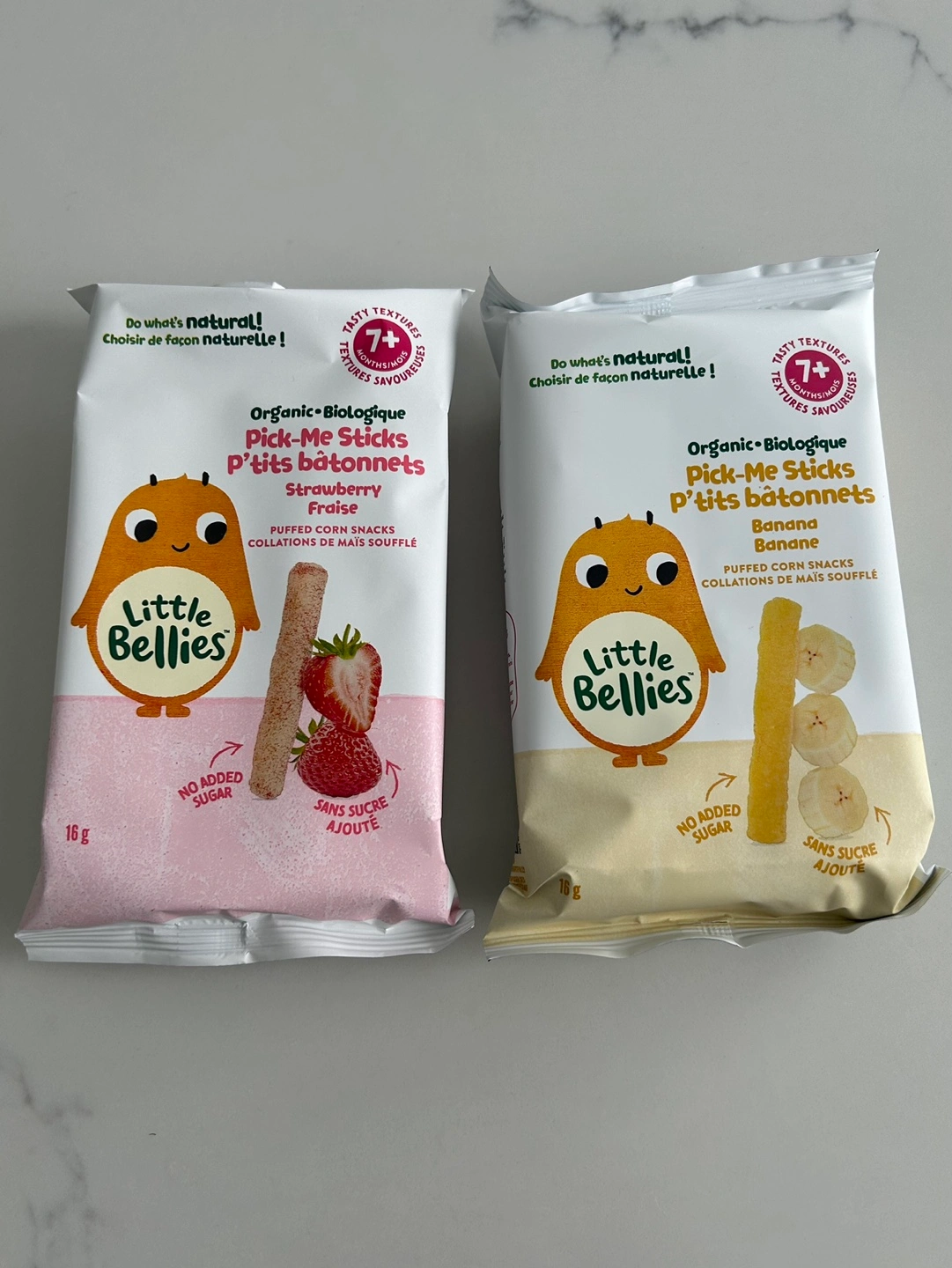 Two pouches of Little Bellies Organic Pick-Me Sticks