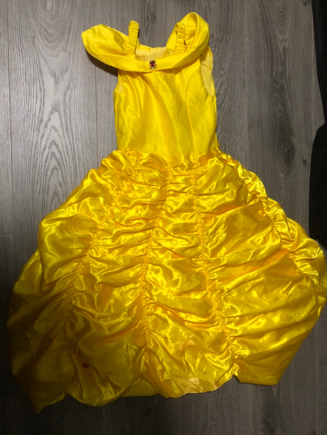 Yellow satin Belle dress. Sleeveless with shoulder detailing. Flowy skirt. Suitable for dress-up or costume.