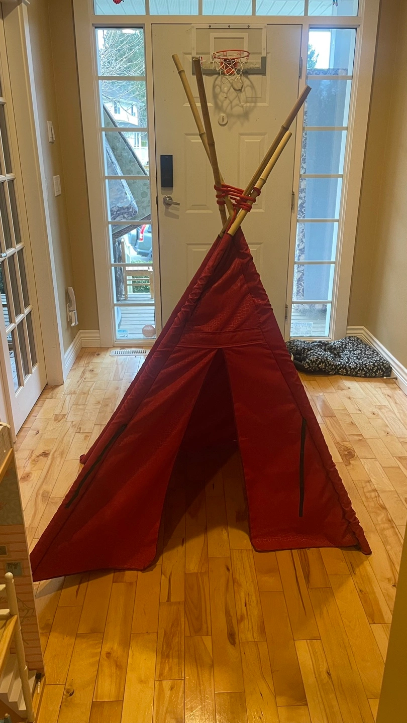 Adorable red play tent, perfect for imaginative play. Material is emasculate silk like. Bamboo poles included. Easy setup and storage.