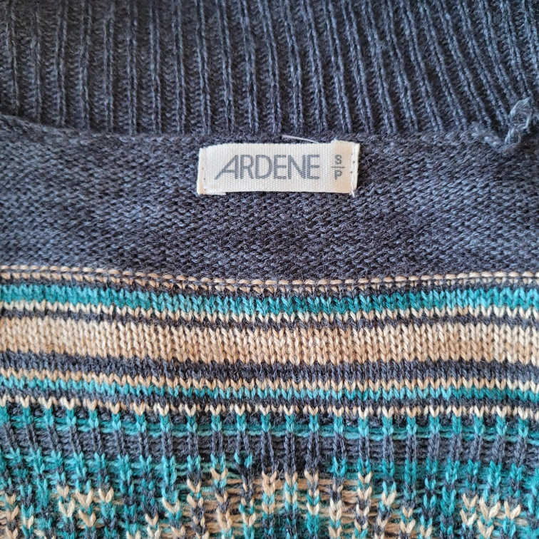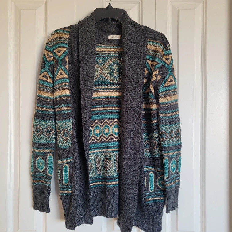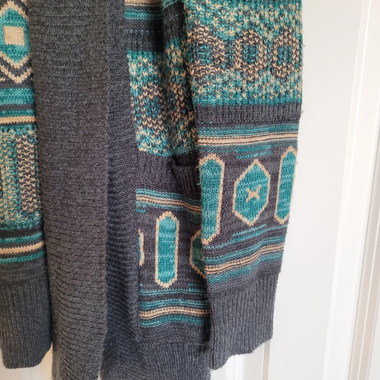 Women's size small cardigan. Teal and beige colour block pattern. Open front. Long sleeves. Two pockets. Some minor pilling.