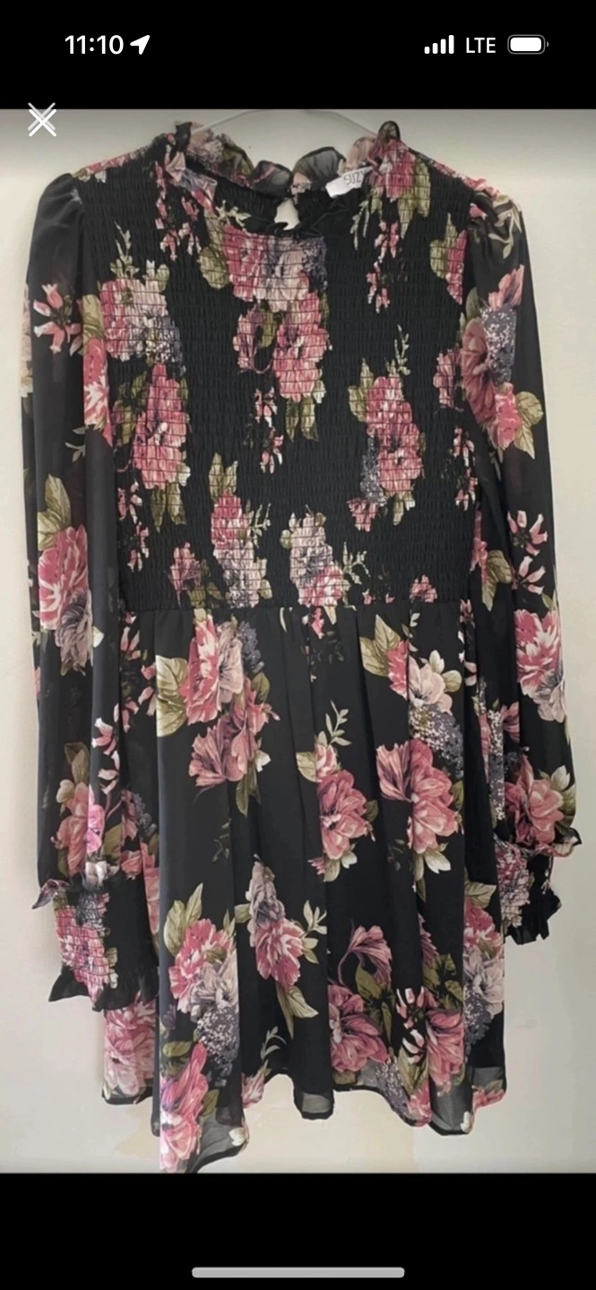 Long sleeve mini dress. Black background with pink and purple flowers. Flowy material. Only used one.