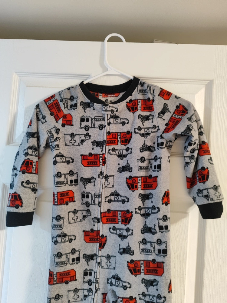 Carter's brand sleeper. Size 5T/5A. Grey fleece. Features red and black emergency vehicles. Long sleeves, footed. Snap closure.