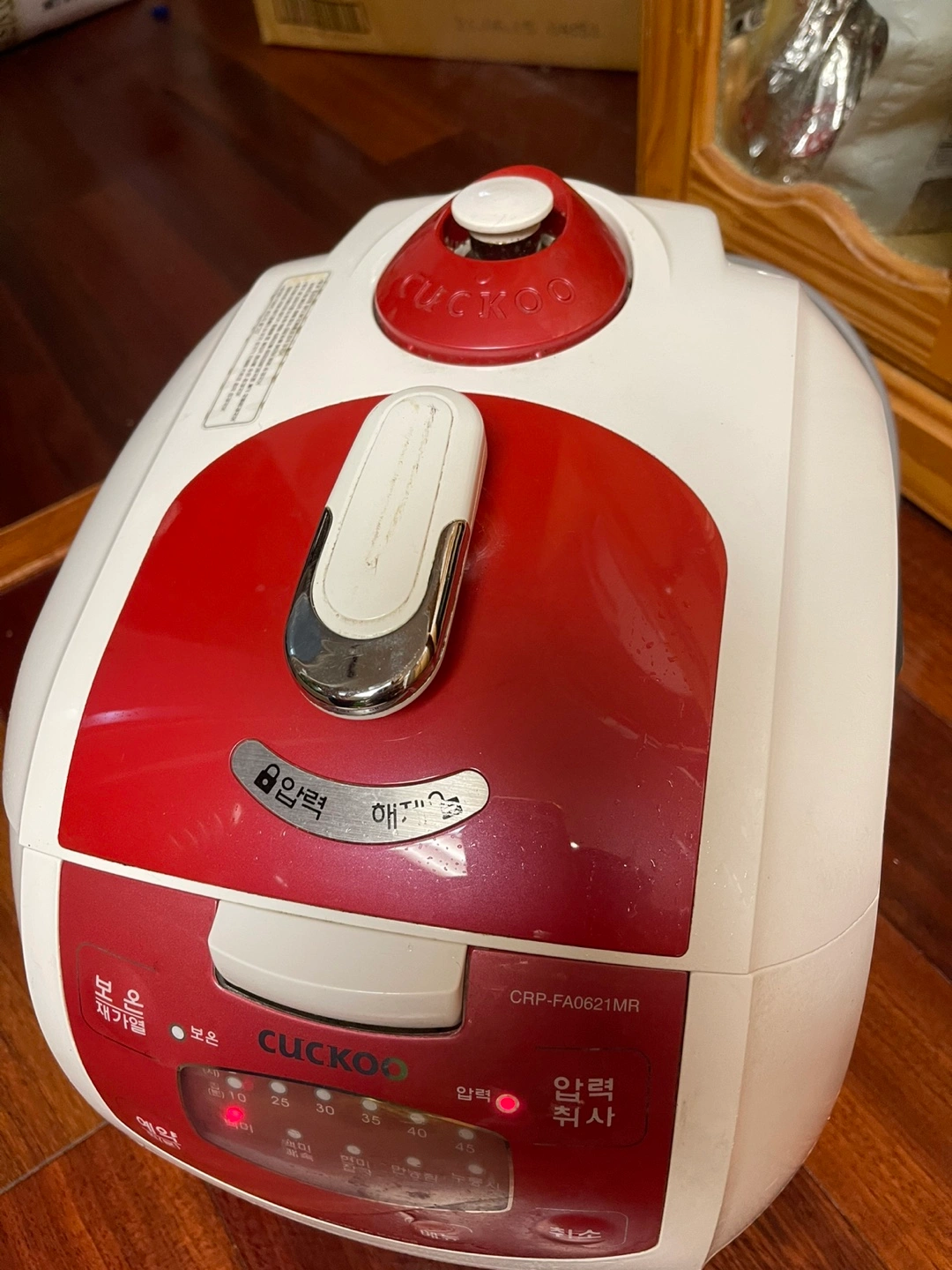 Pre-owned Cuckoo rice cooker. Model number CRP-FA0621MR. Red and white. Features various cooking functions. Made in Korea. 220V.