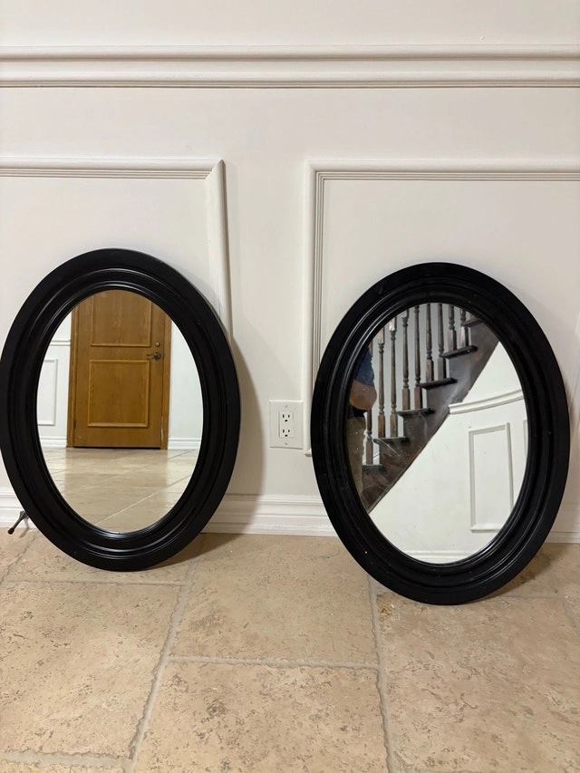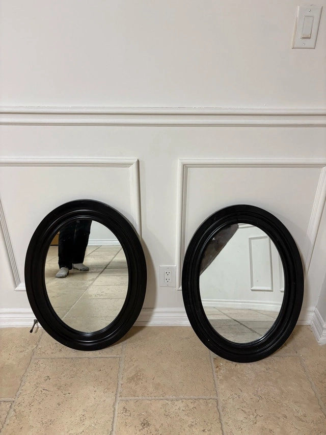 I am selling two black oval mirrors that would make a great addition to any room. They have been previously enjoyed, but are still in good condition with no major scratches or blemishes. Shape: Oval, Colour: Black, Condition: Used. These mirrors are looking for a new home! If the ad's still up, they're still available! Priced at $60 for the pair.
