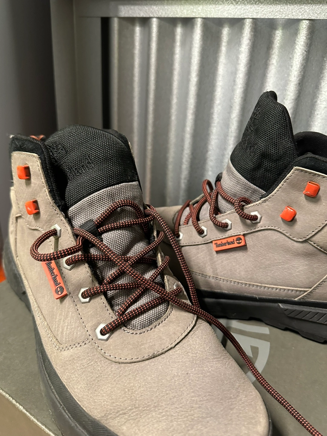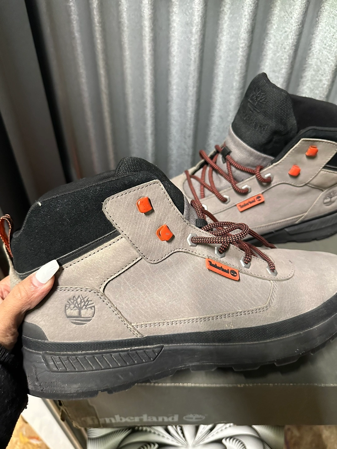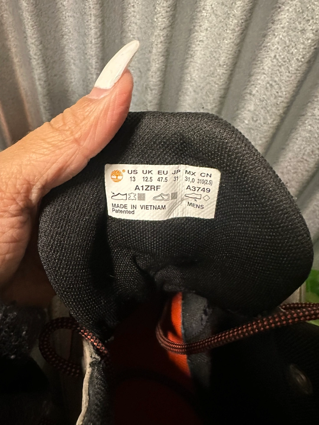 Men's Timberland hiking boots. Grey suede upper, black accents. Orange laces and detailing. Size 13 US. Made in Vietnam.