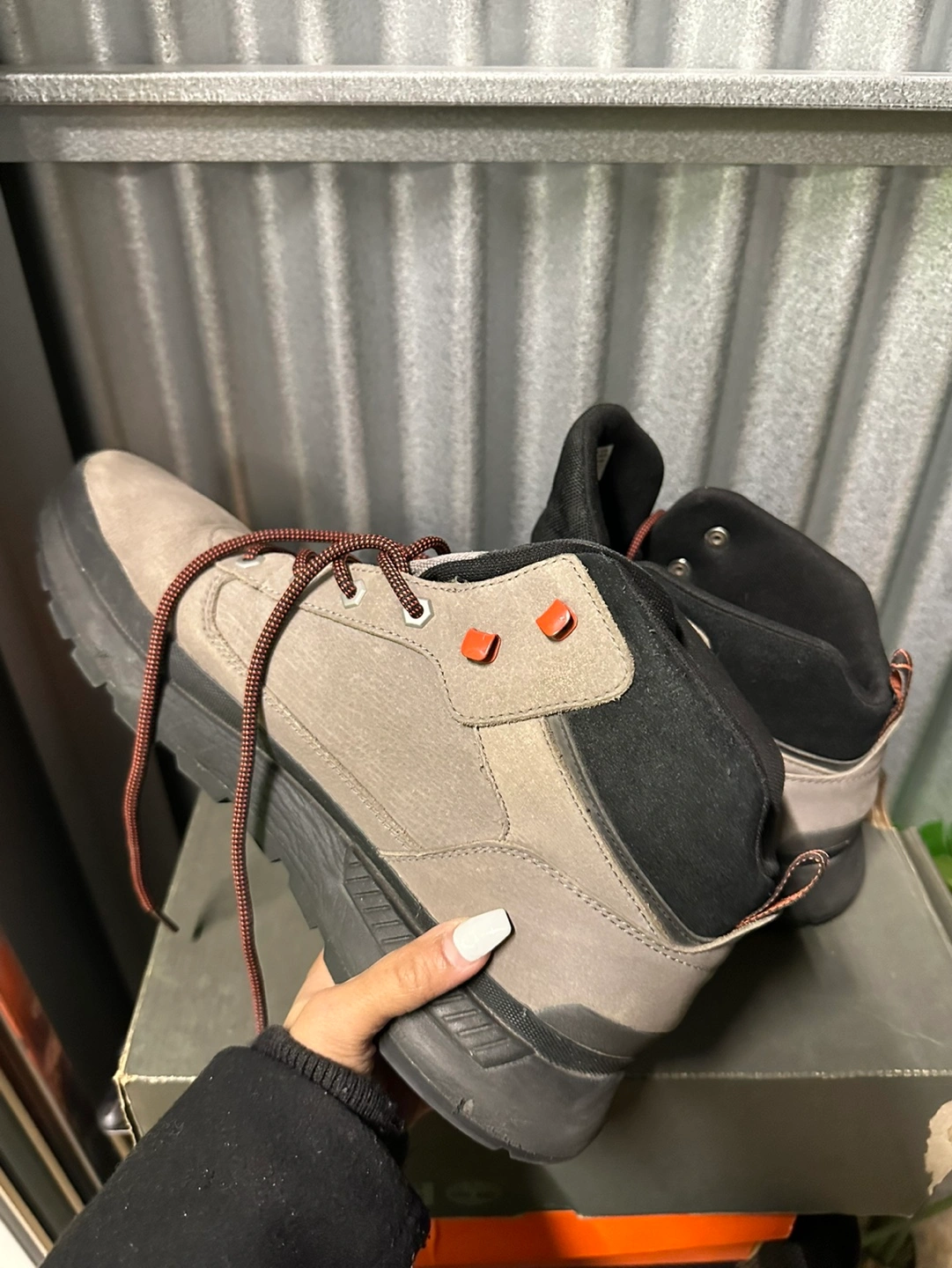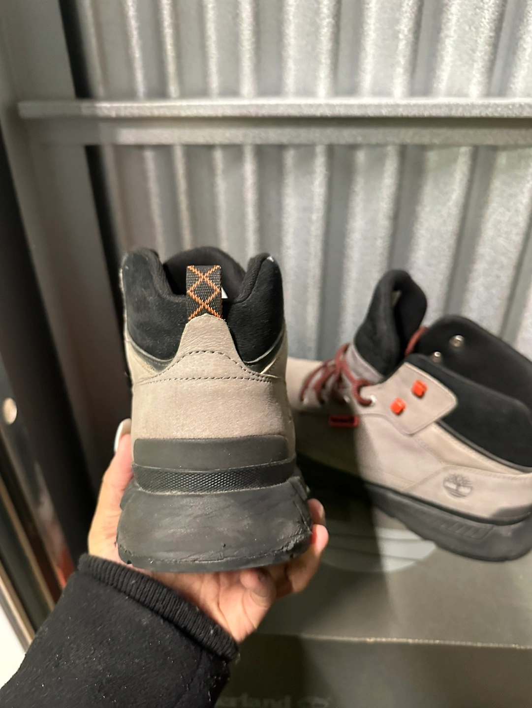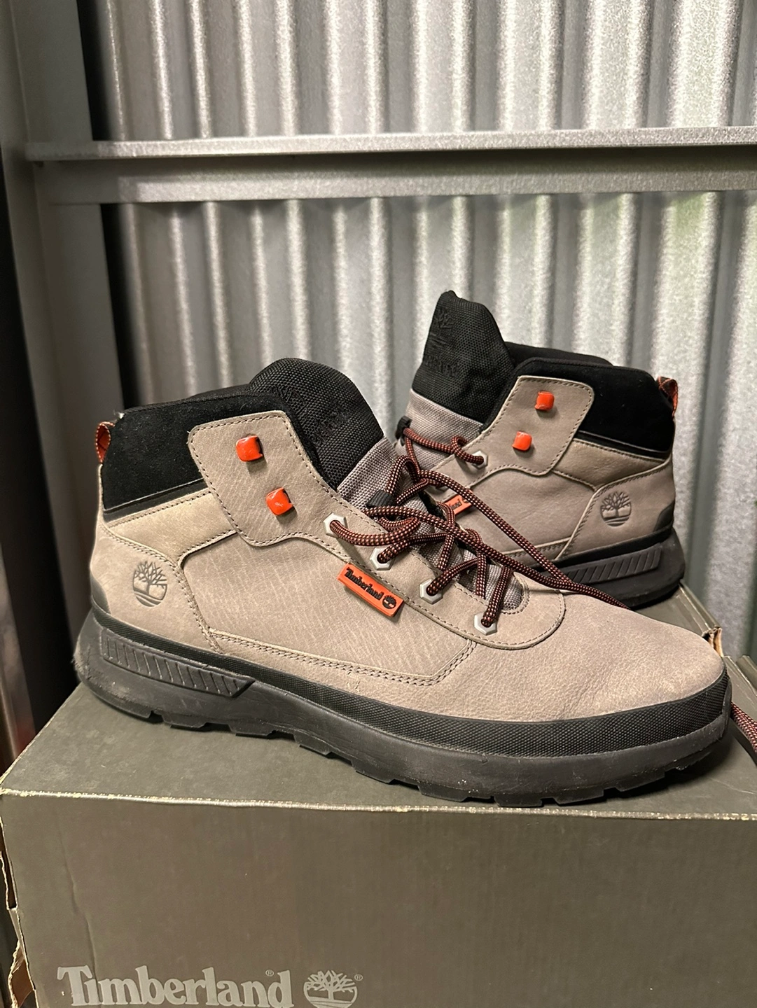 Men's Timberland hiking boots. Grey suede upper, black accents. Orange laces and detailing. Size 13 US. Made in Vietnam.