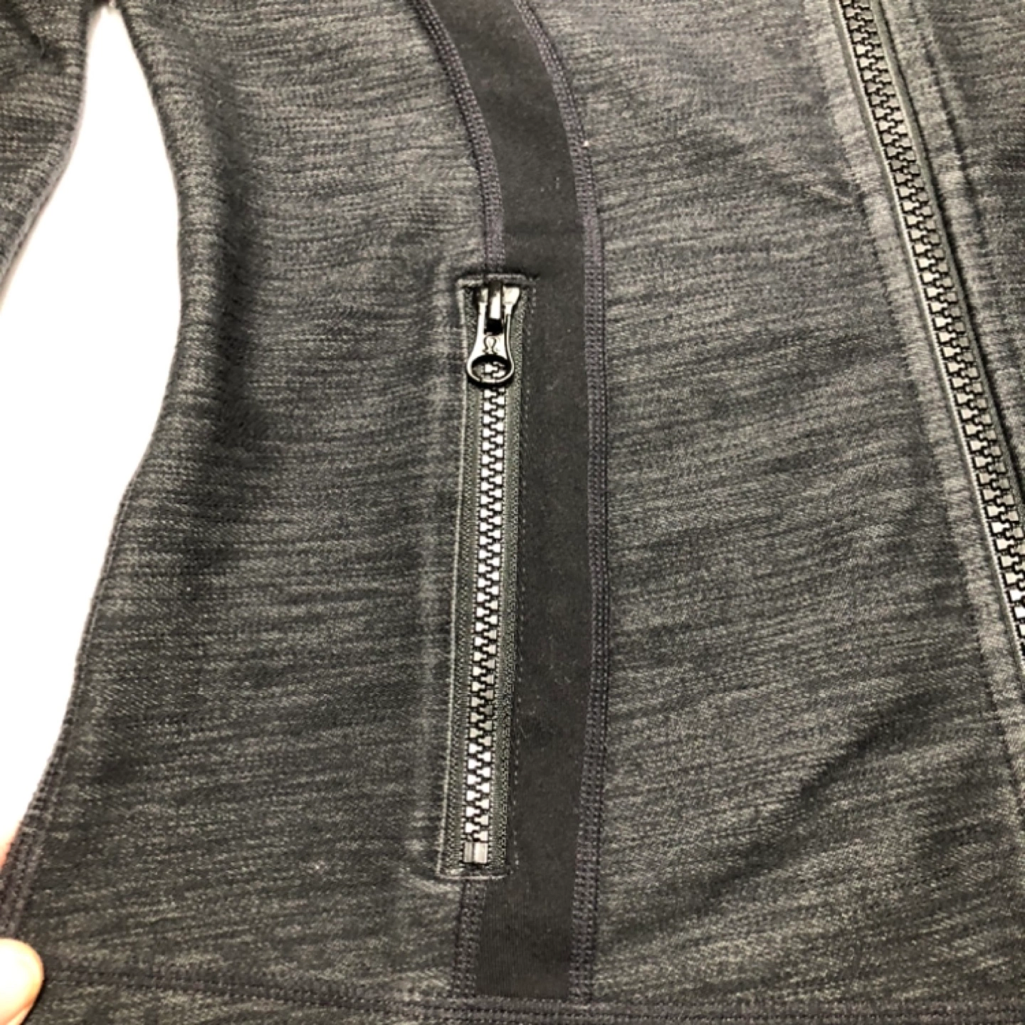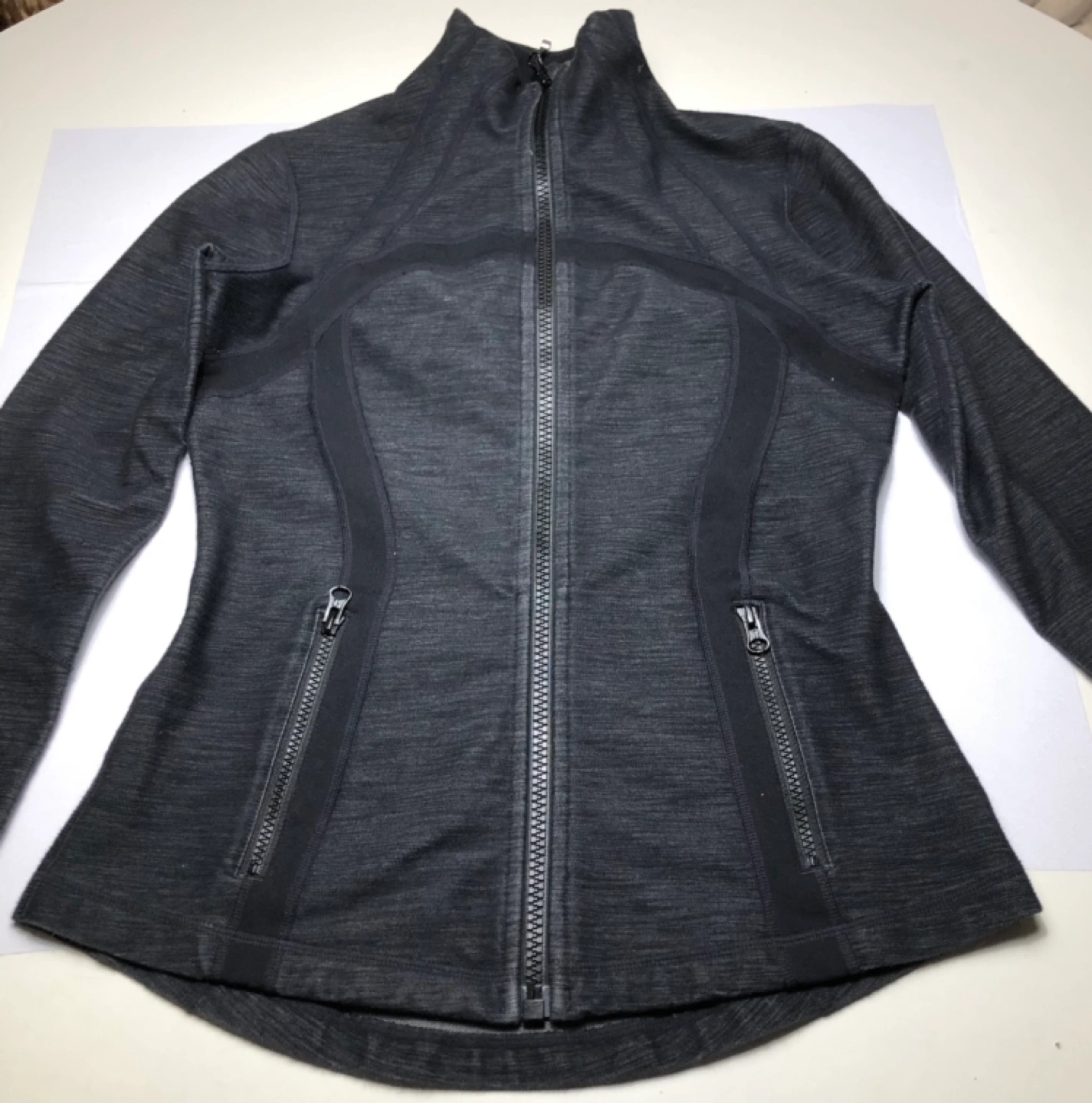 Women's Lululemon “Define” zip up hoodie. Full zip. Thumbholes. Zippered Side pockets. Dark grey heather colour.