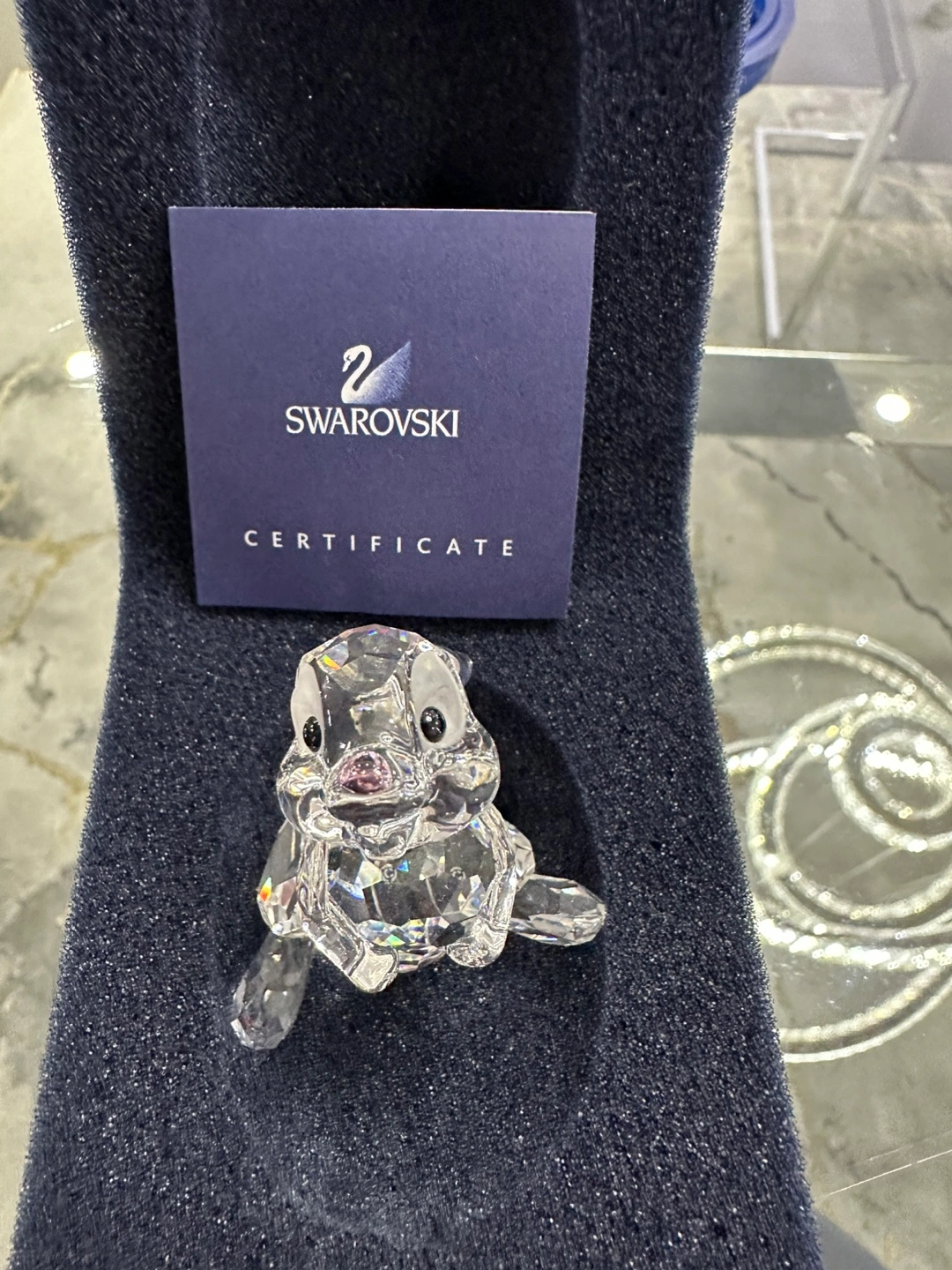 Adorable crystal Thumper figurine. Clear crystal with pink accents. Includes original Swarovski certificate. Collectible item, perfect for display.