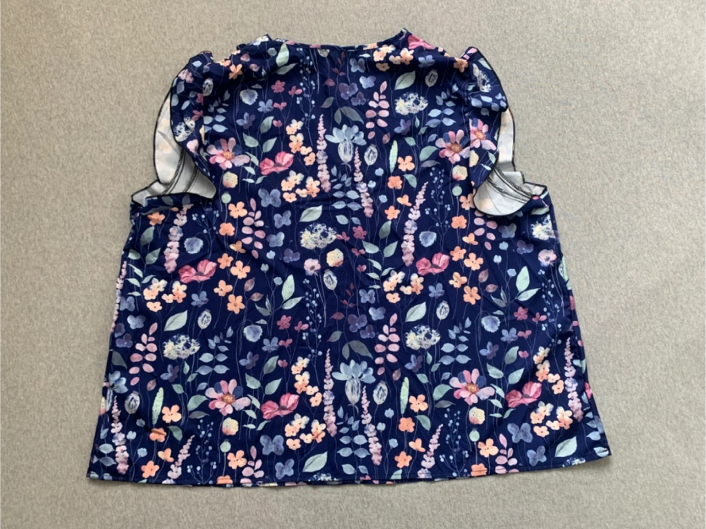 Brand New With Tags Navy blue pullover blouse with a vibrant floral print and scalloped cap sleeves. Features a V-neck and faux button-up front.