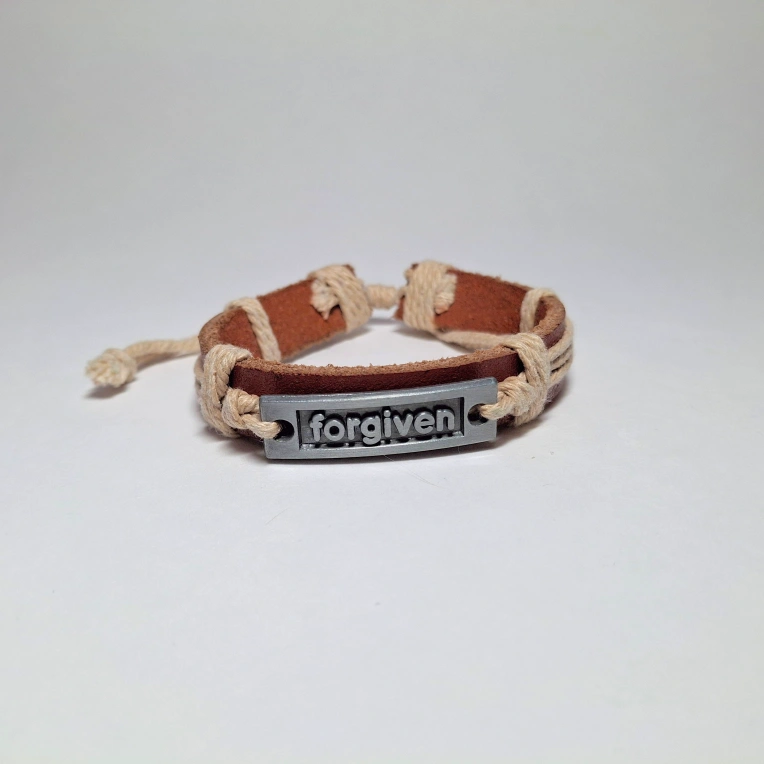💎 Adjustable leather bracelet. Includes a small metal lining with the words "Forgiven" inscribed. Accented with beige coloured rope. In very good condition! Lightly used.