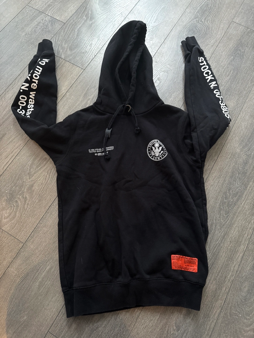 Black pullover hoodie. Features a drawstring hood, long sleeves with text print, and a small logo on the chest. Size medium. Unisex. Very Warm.