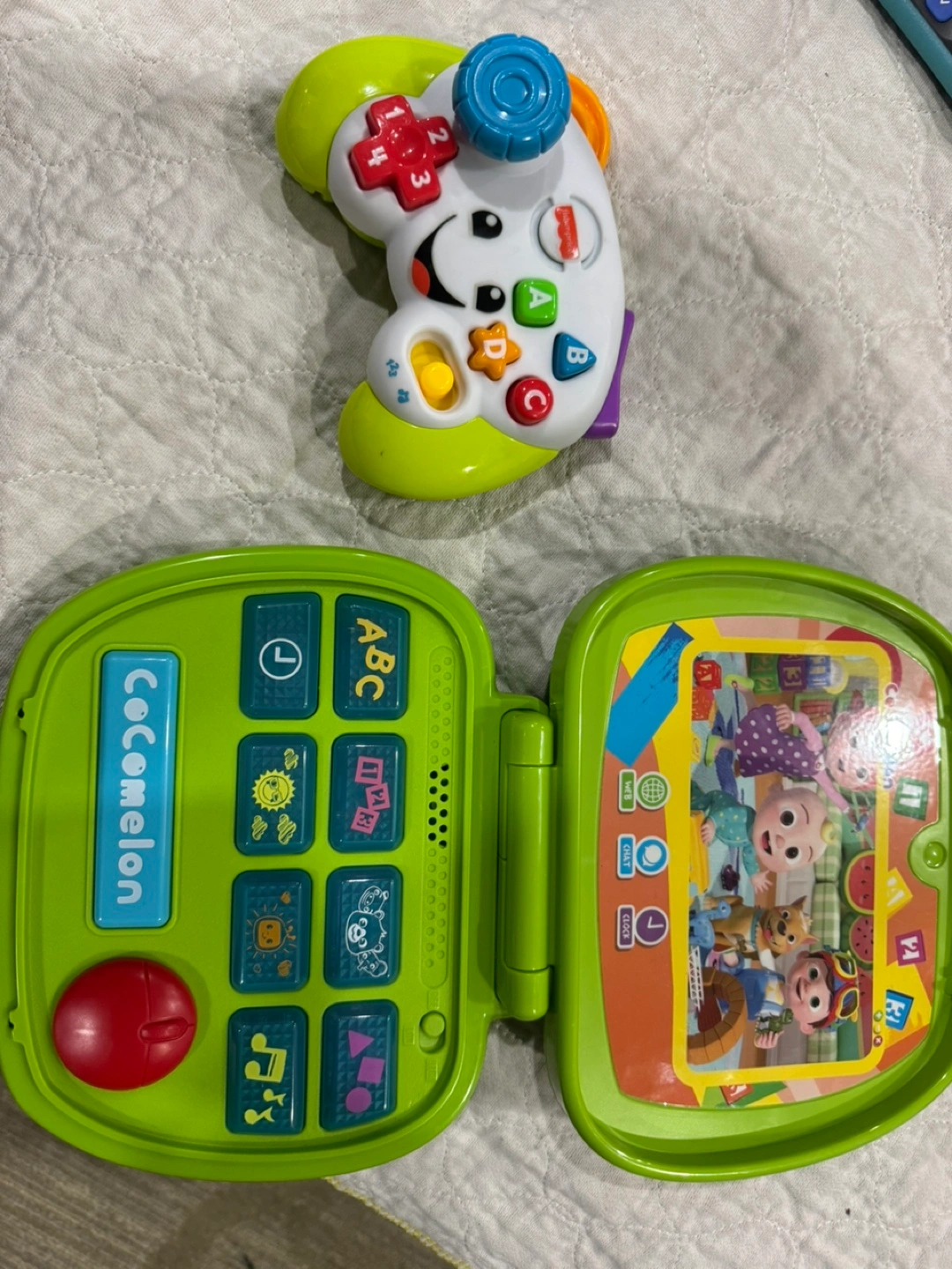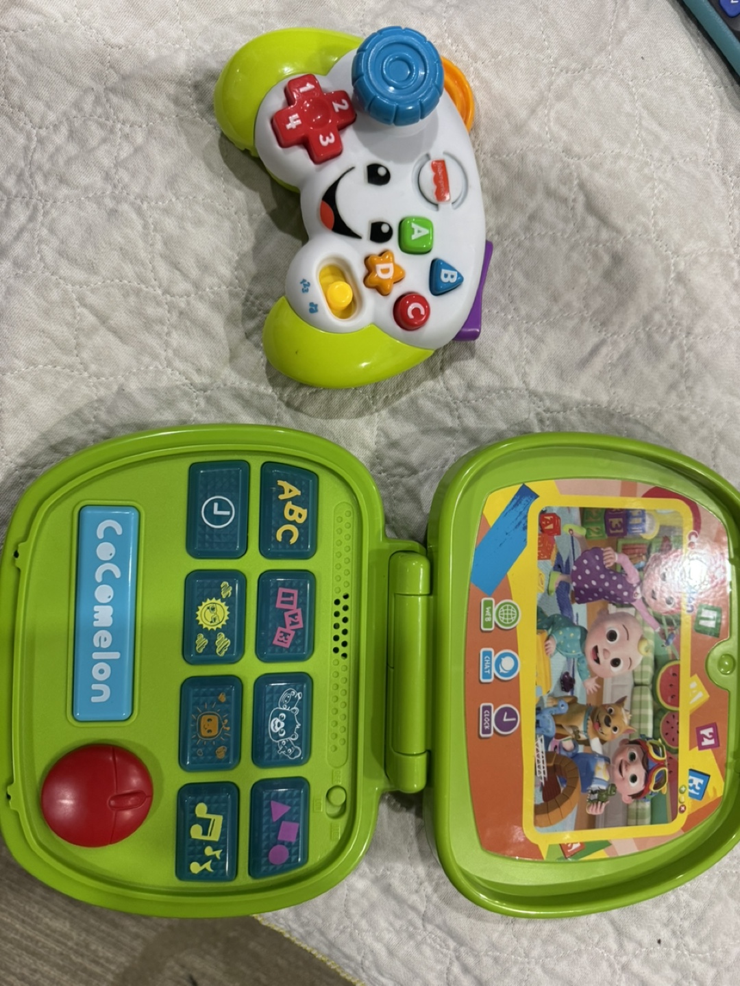 Pre-loved Cocomelon toy set. Includes a laptop and a controller. Features colourful design and buttons. Great for toddlers.
