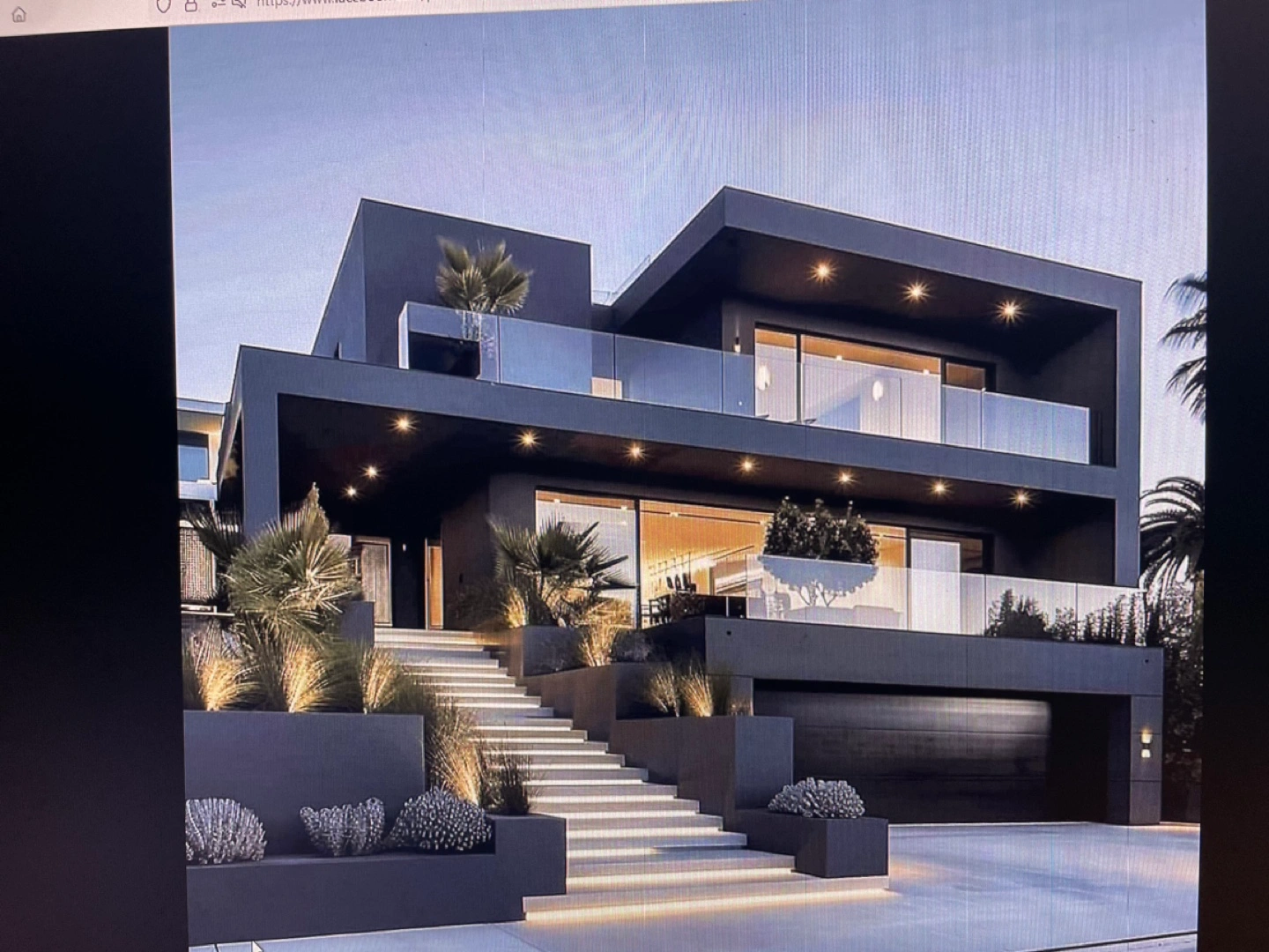 Stunning modern home design. Two-story, dark exterior, glass railings, spacious balconies, and a large garage. Landscaped with succulents and palm trees. Elegant staircase.