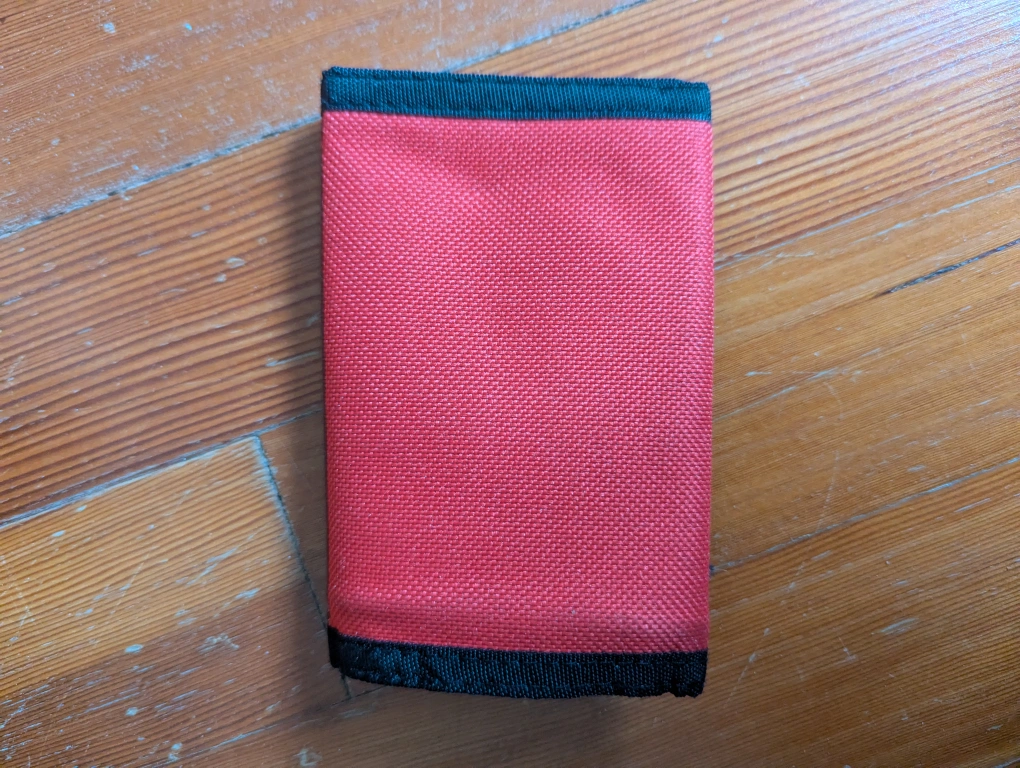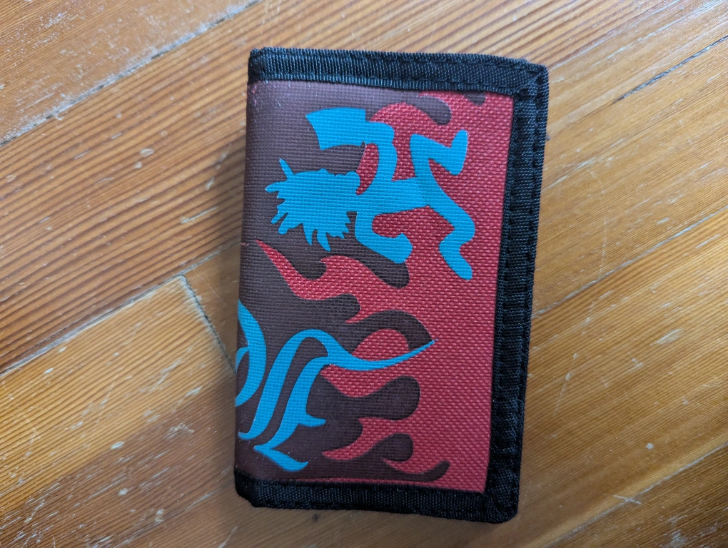 Small tri-fold wallet. Features multiple card slots and a zippered coin pouch. One side features a graphic design, another is solid red. Black trim.