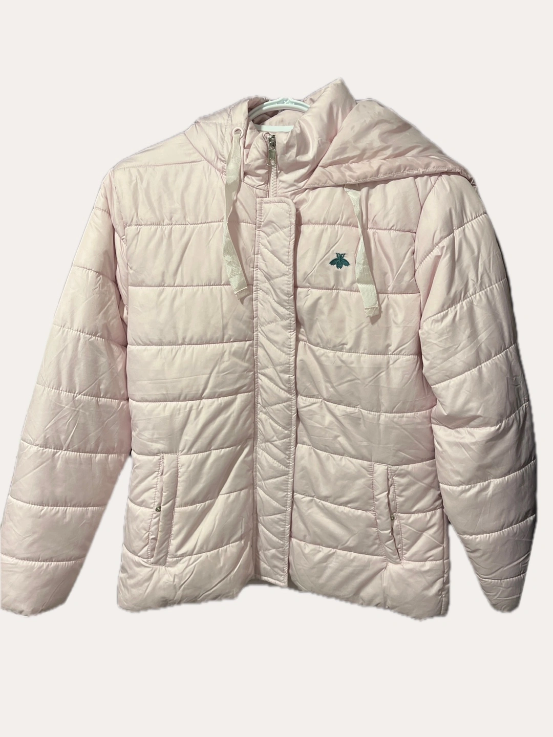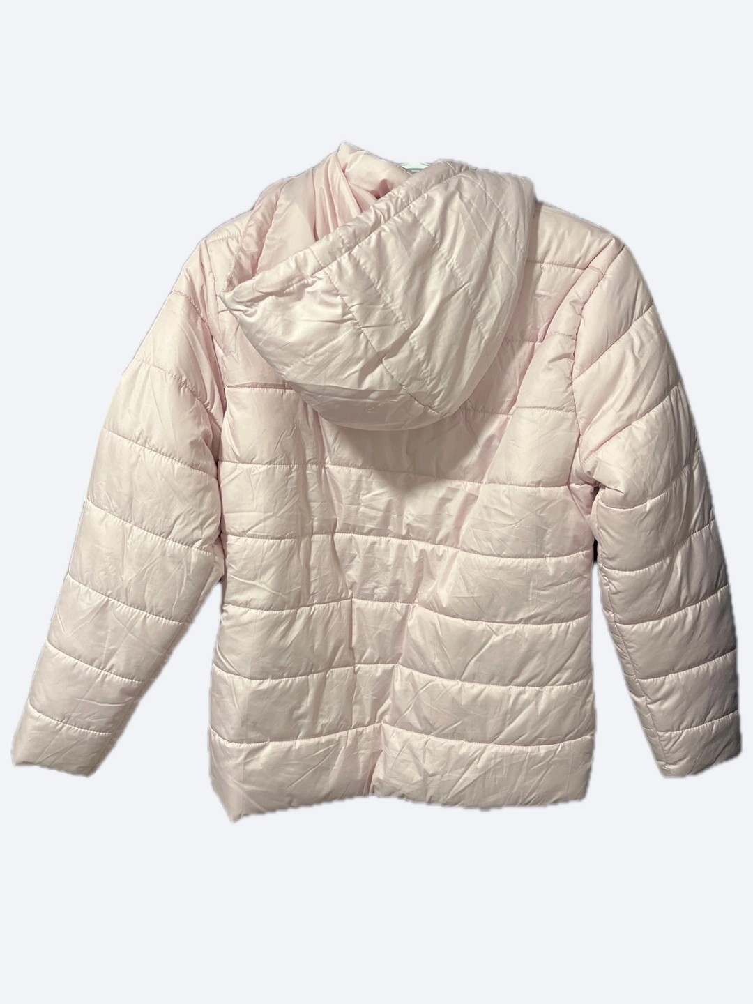 Lightweight pink puffer jacket. Features a hood with drawstrings and zipper closure. Two pockets. Excellent for layering.