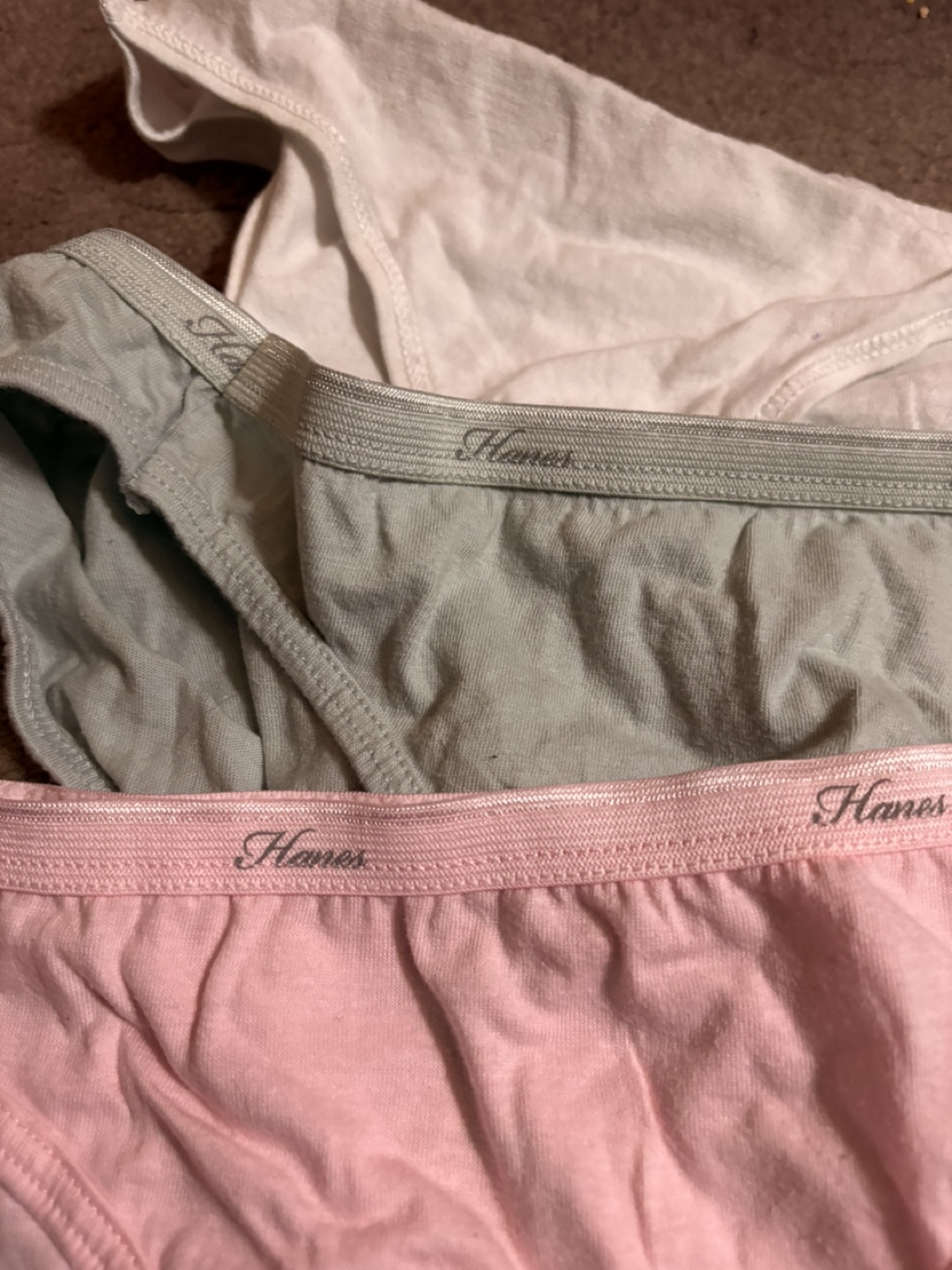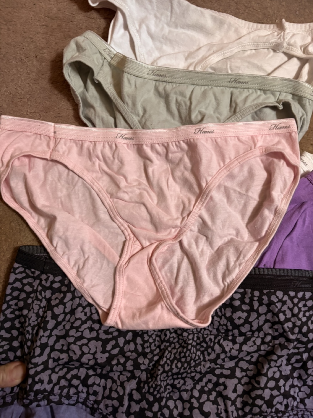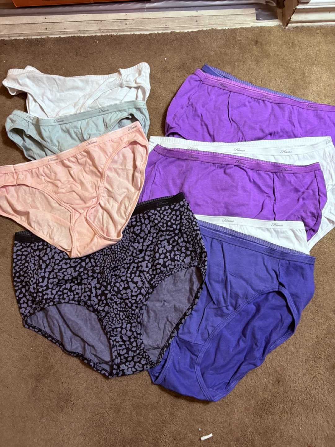 Eight pairs of women's underwear. Assorted colours and patterns. Mostly solid colours, one pair with a leopard print. 100% cotton. Size may vary.