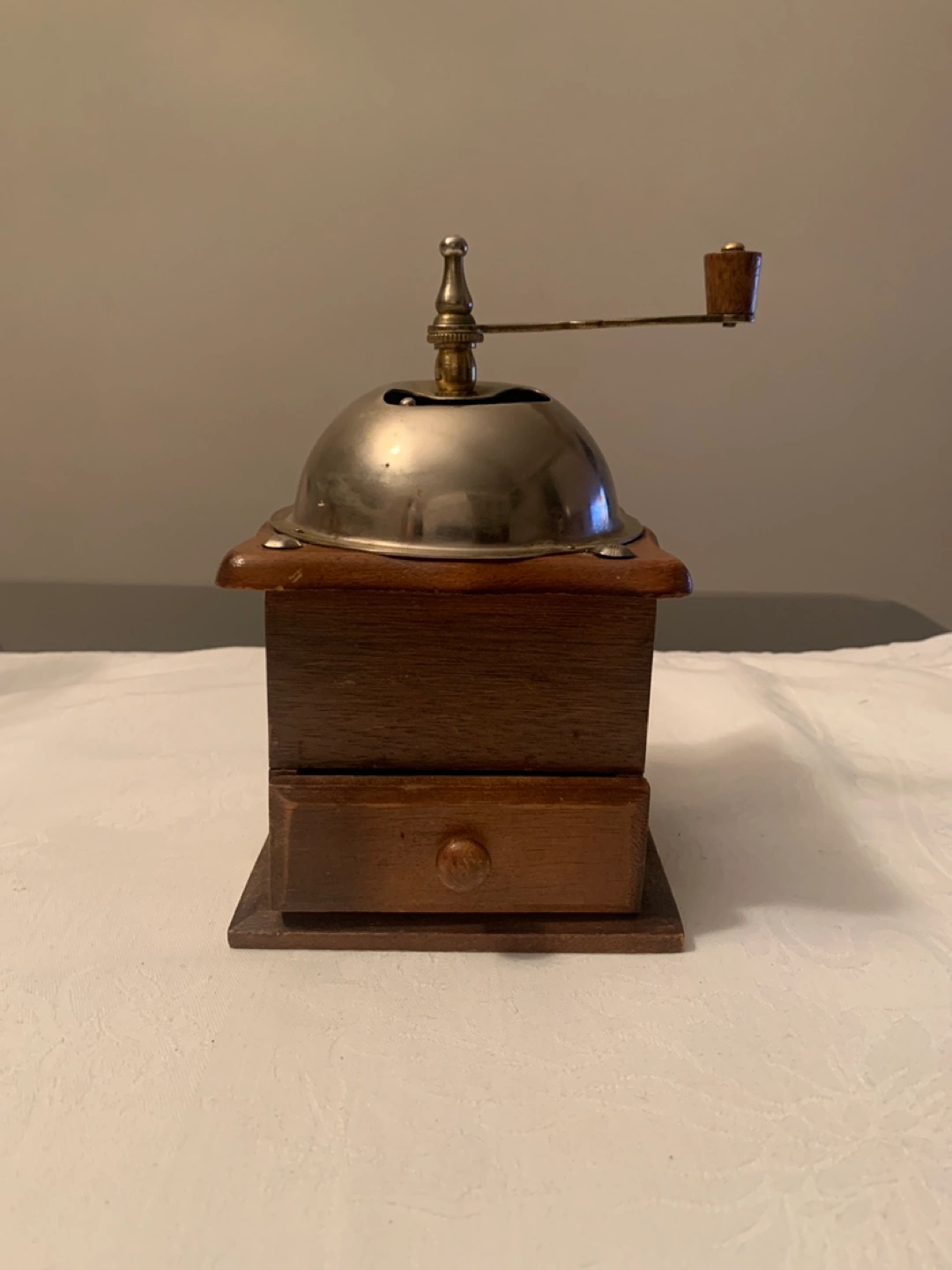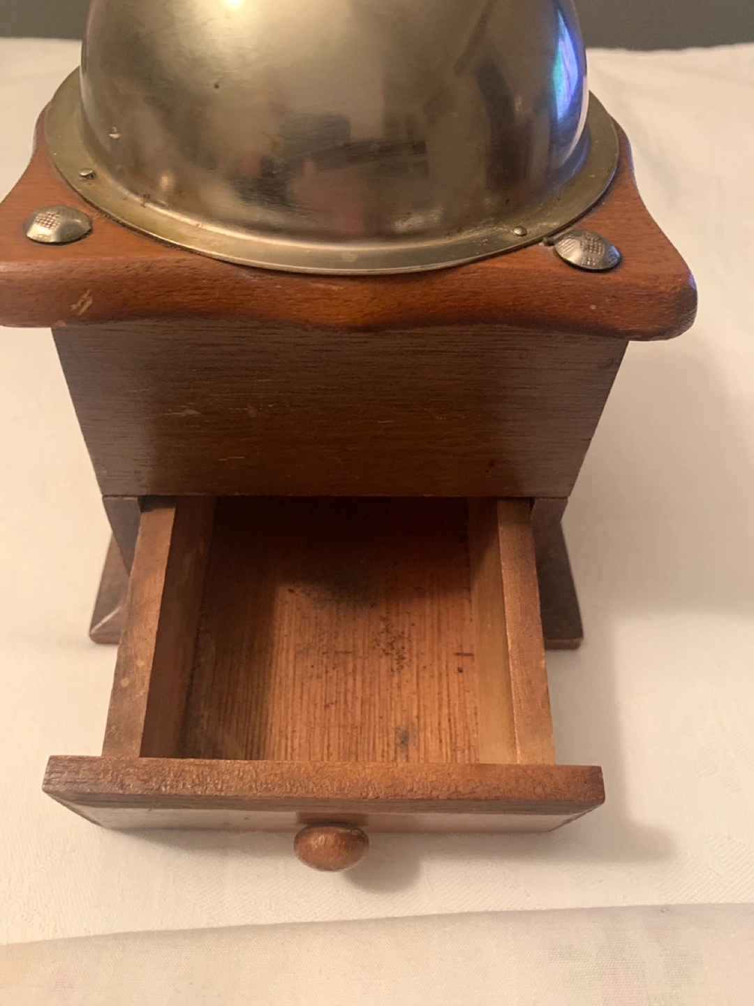 Antique coffee grinder. Wooden construction, metal grinder. Features a small drawer. Manual operation.