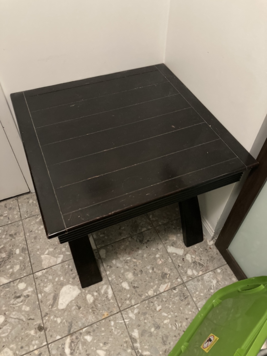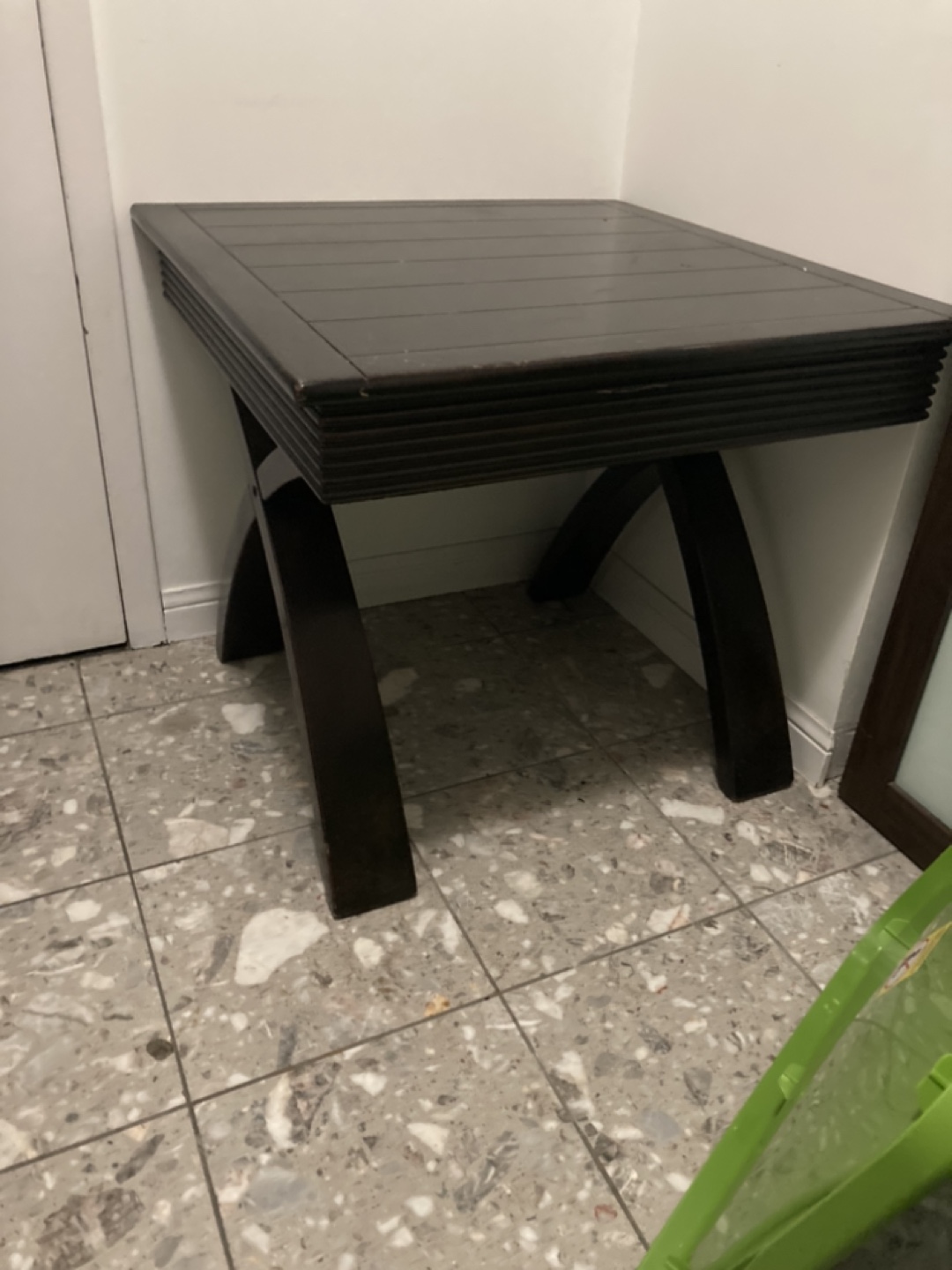 Small square end table. Dark brown finish. Unique X-shaped legs. Good condition. Some surface scratches. Solid wood.