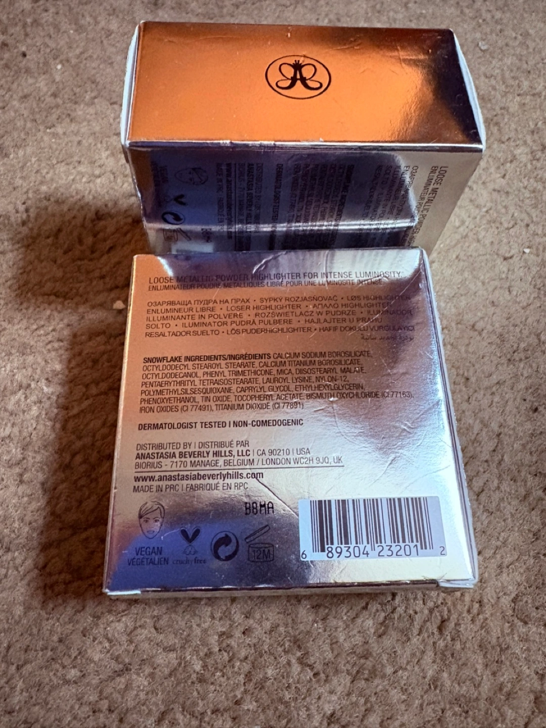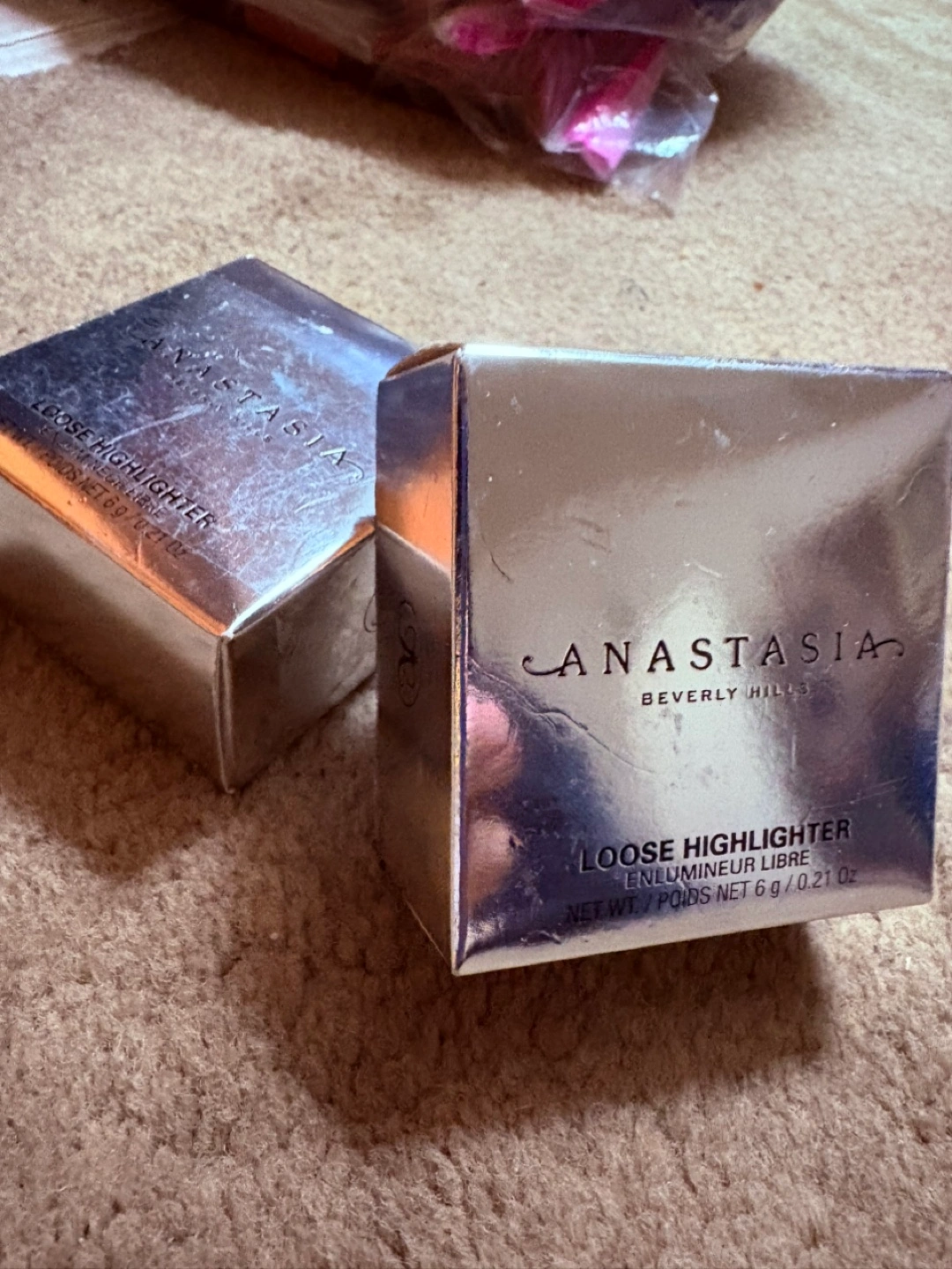 Two unopened boxes of Anastasia Beverly Hills Loose Highlighter. 6g / 0.21 oz each. Silver packaging. Vegan and cruelty-free.