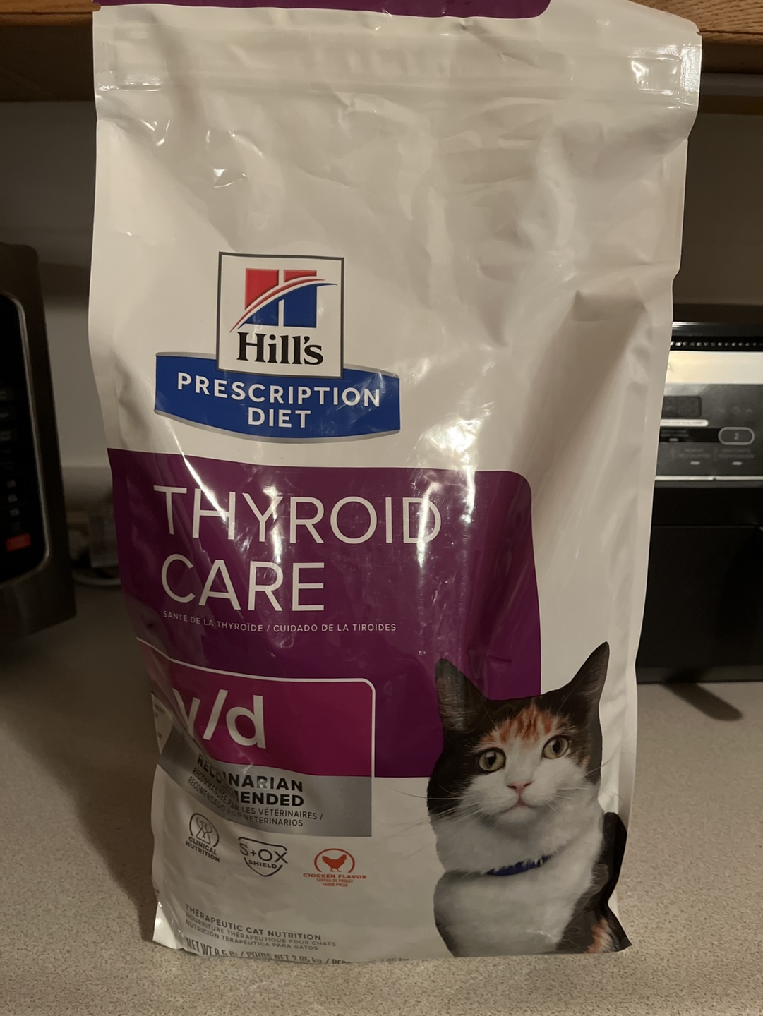 Bag of Hill's Prescription Diet Thyroid Care cat food. Chicken flavour. Veterinarian recommended. Therapeutic cat nutrition.