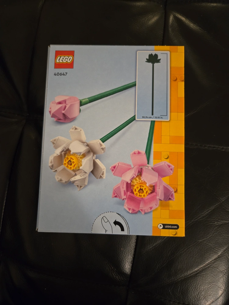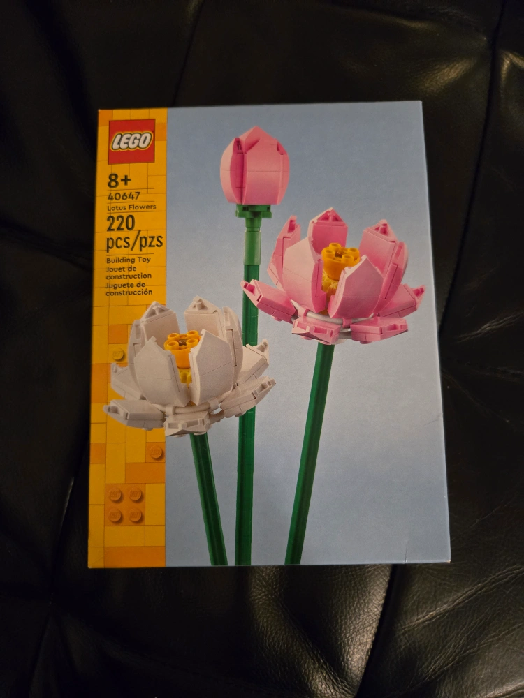 New LEGO building kit. Set number 40647. Features pink and white lotus flowers. 220 pieces.