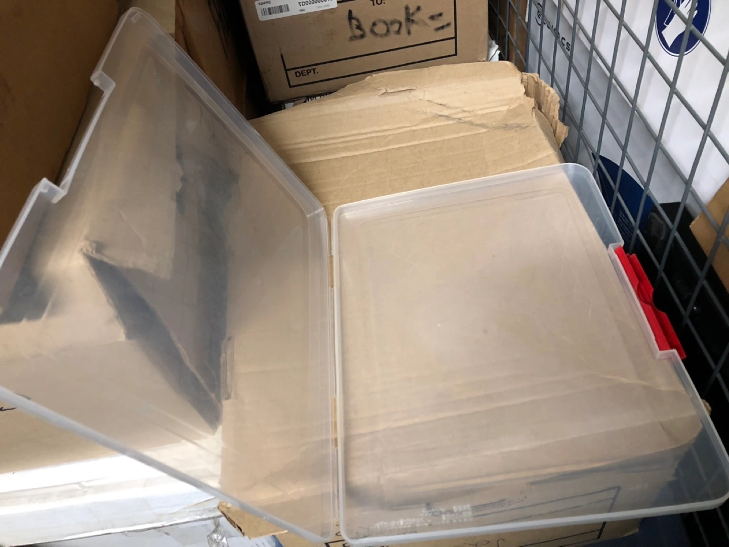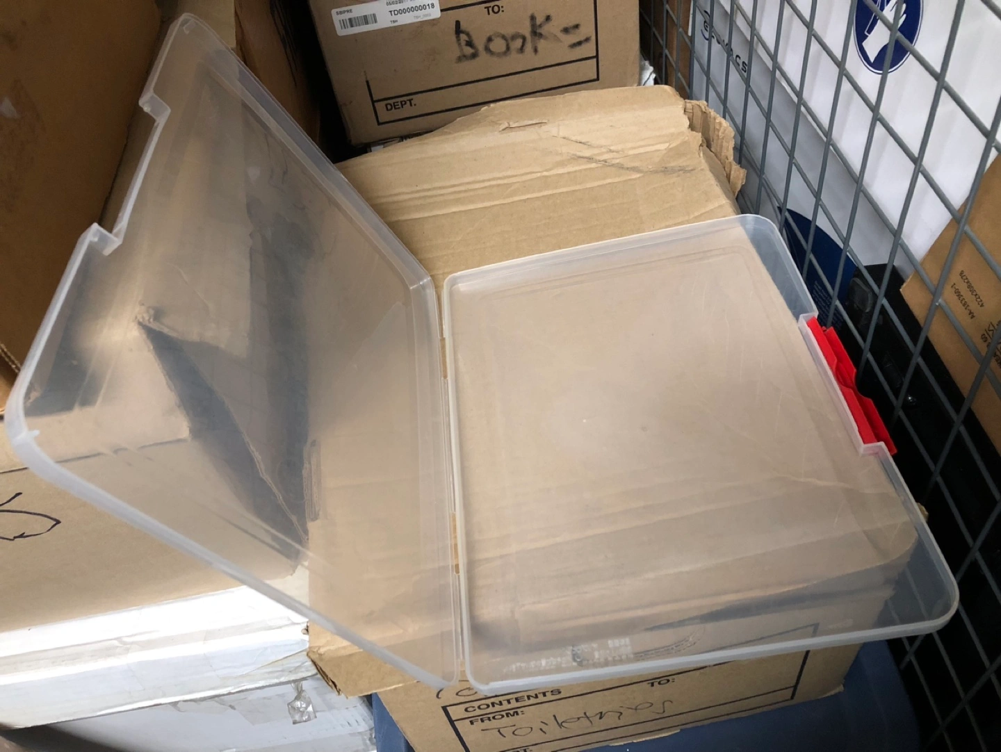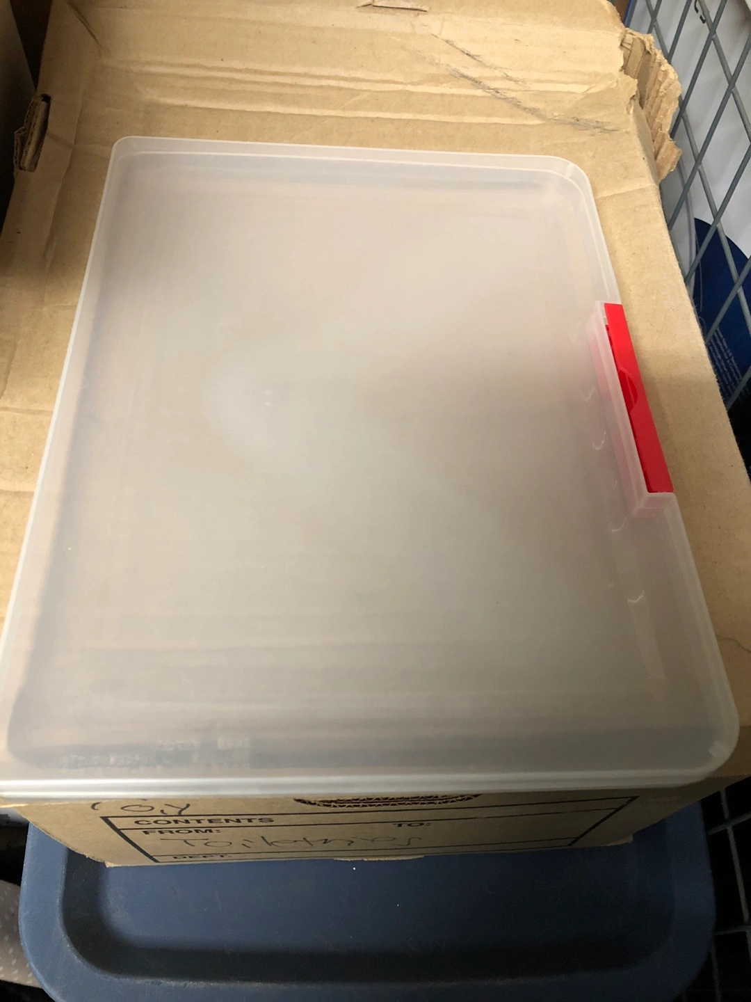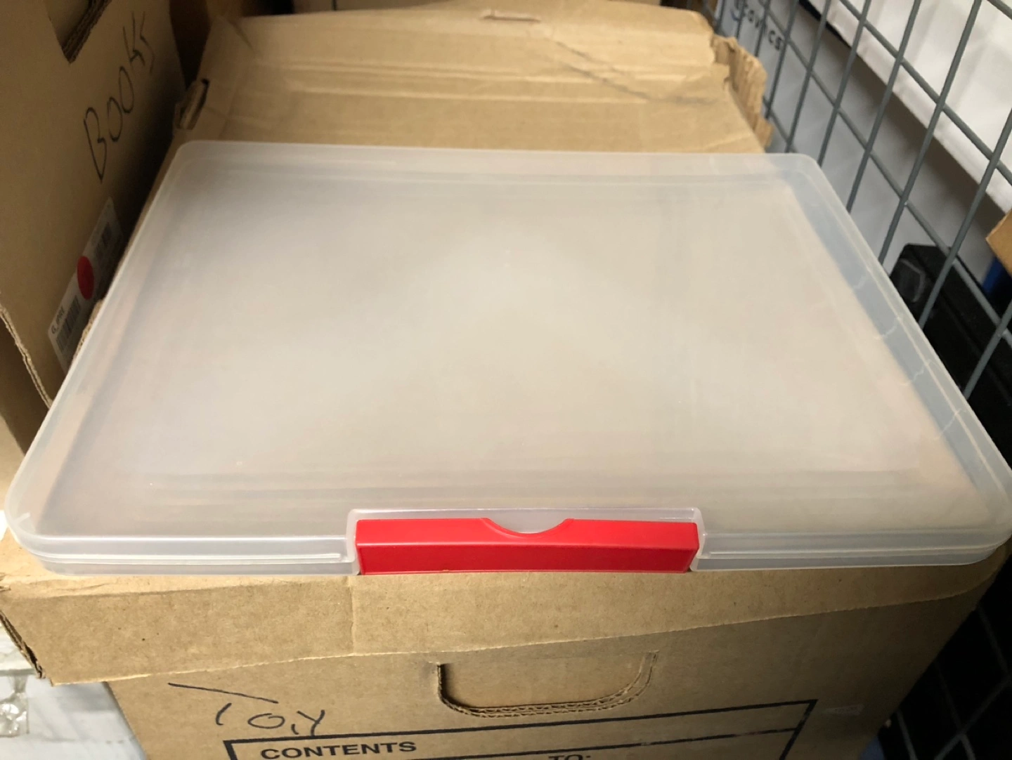 1000+Large, clear plastic storage box. Features a red clasp. Ideal for organizing documents or other small items. Lightweight and easy to carry. Pick up at Leslie/Sheppard near North York IKEA. From smoke-free pet-free home. Please see other listings.