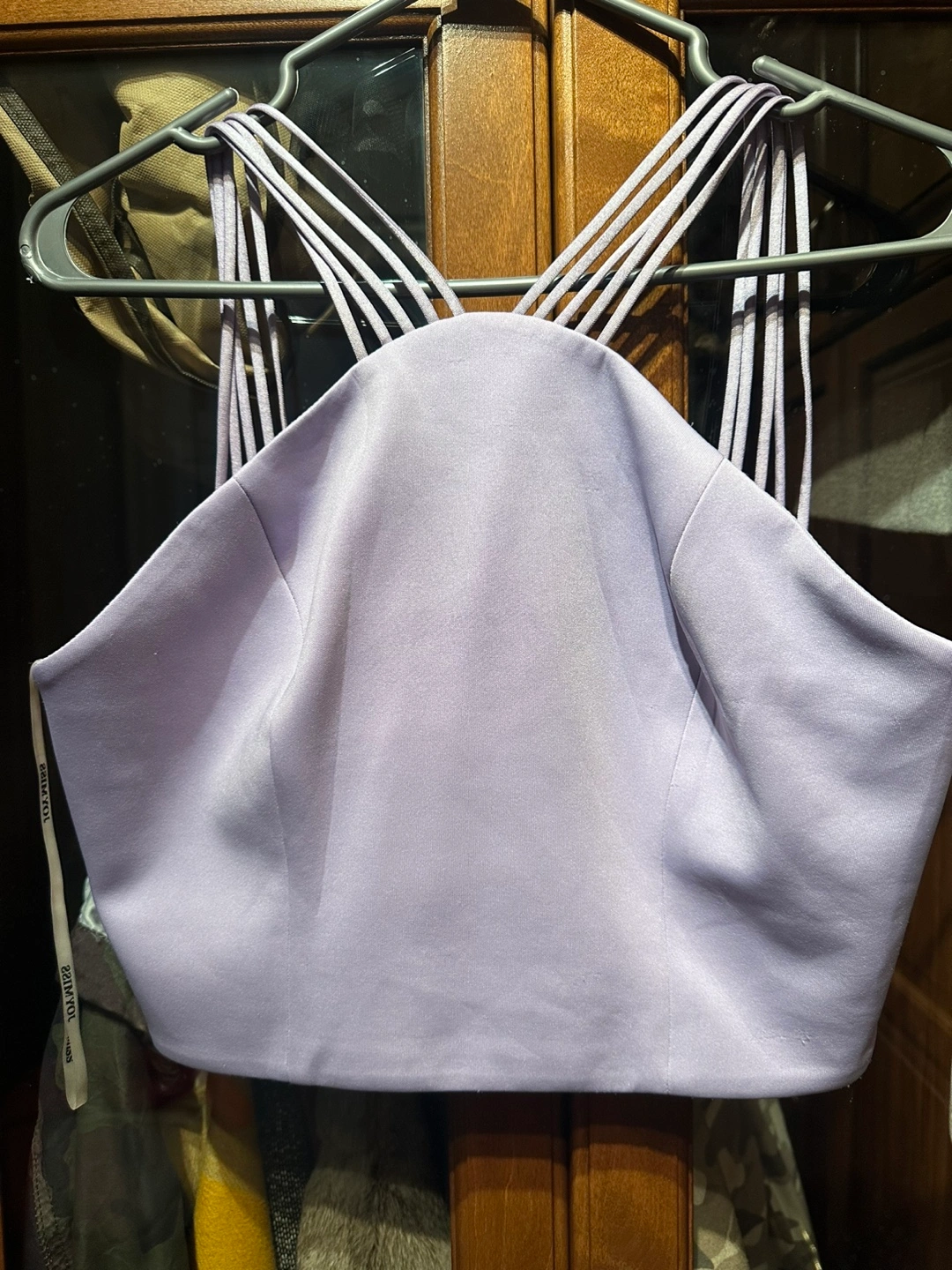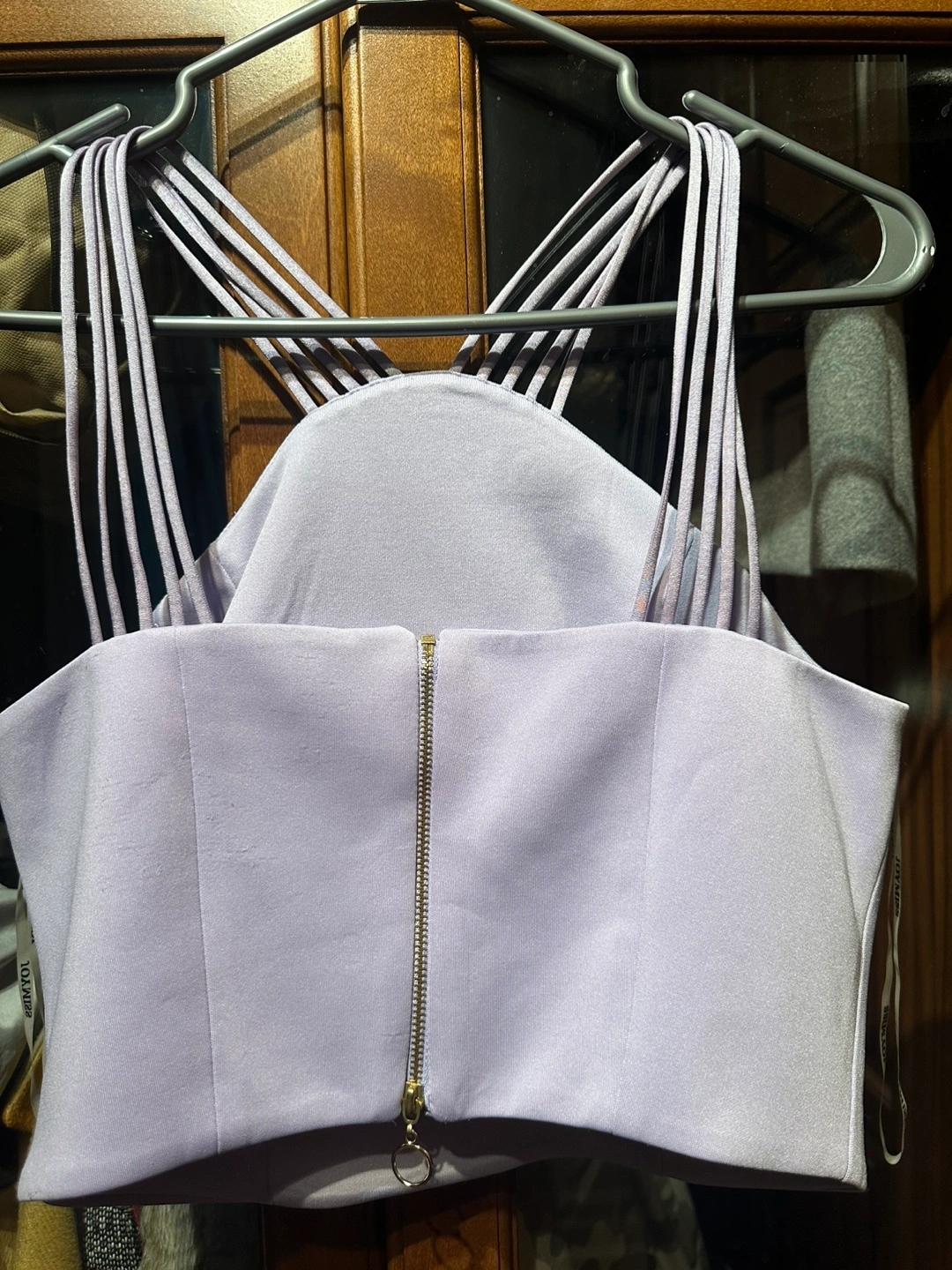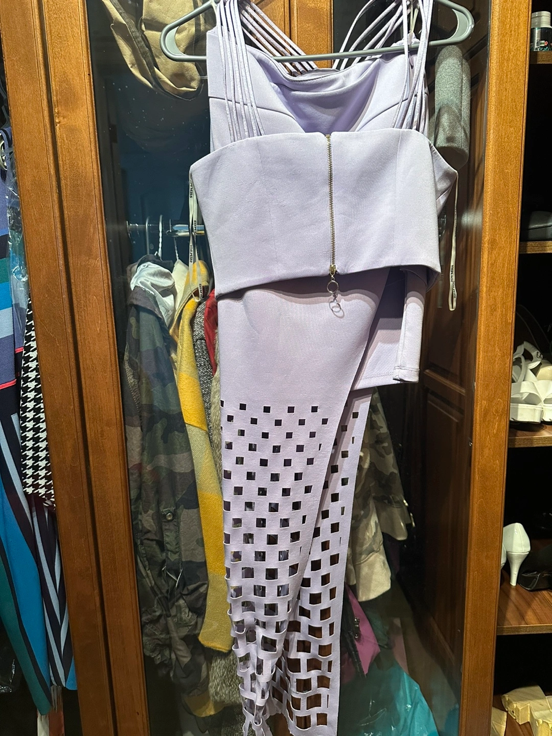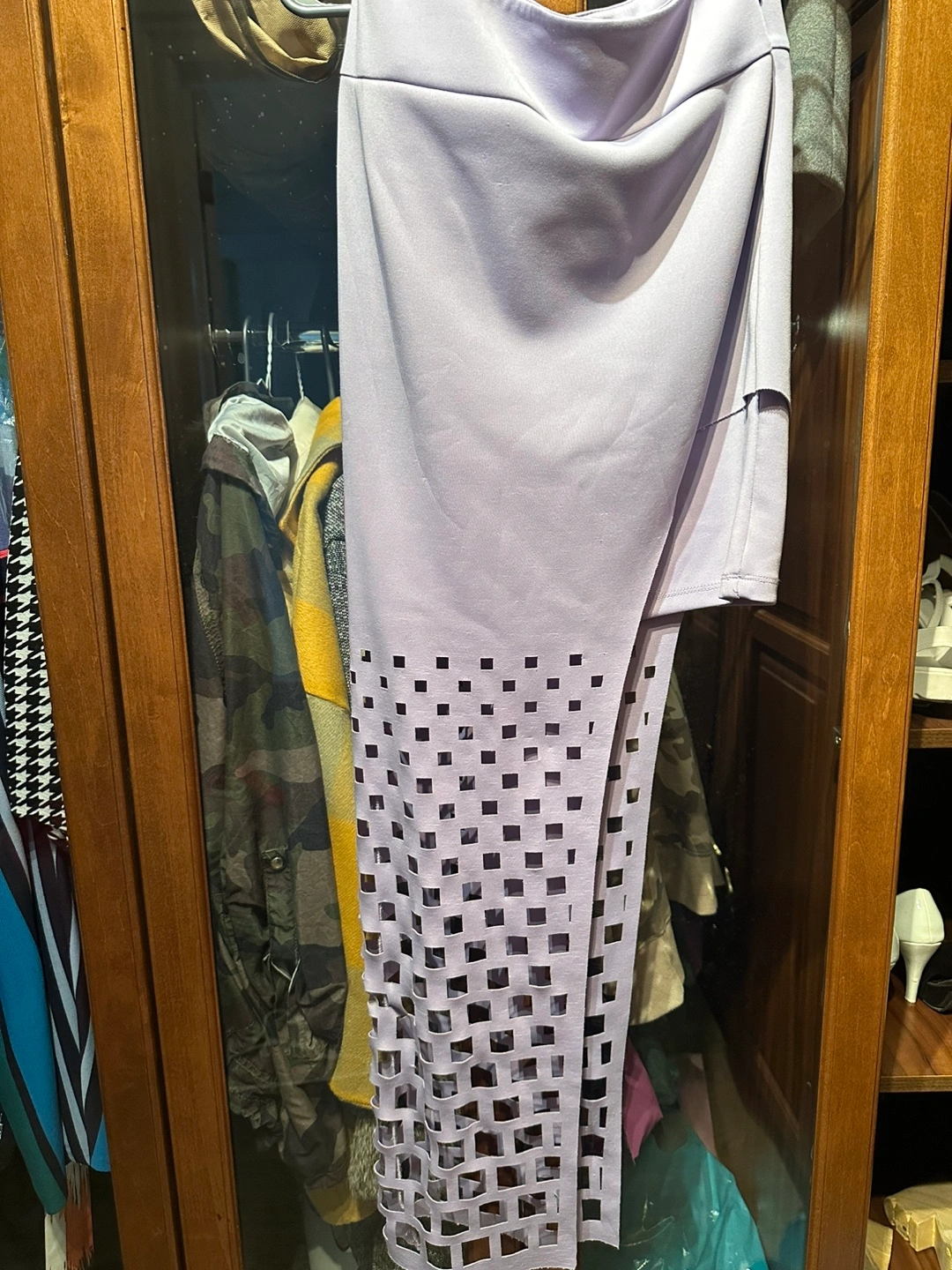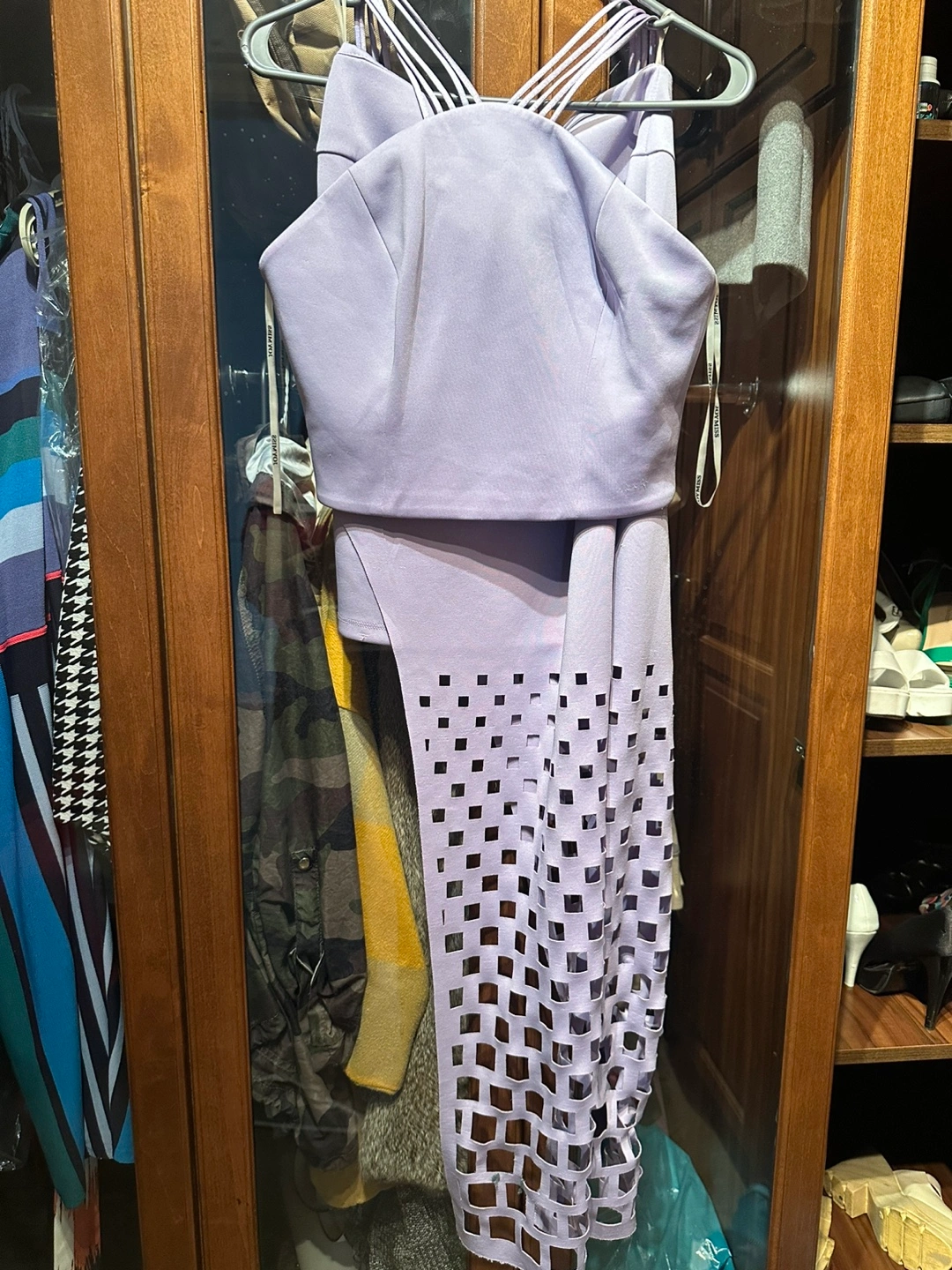 Stunning lavender two-piece outfit. Features a high-waisted, asymmetrical skirt with cut-out detailing and a matching cropped halter top. Perfect for a special occasion.
