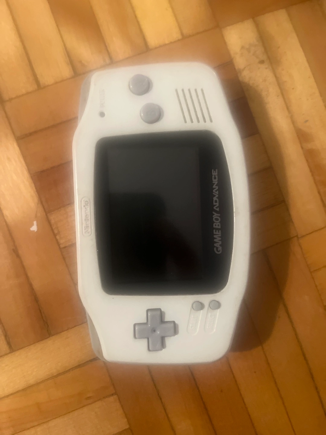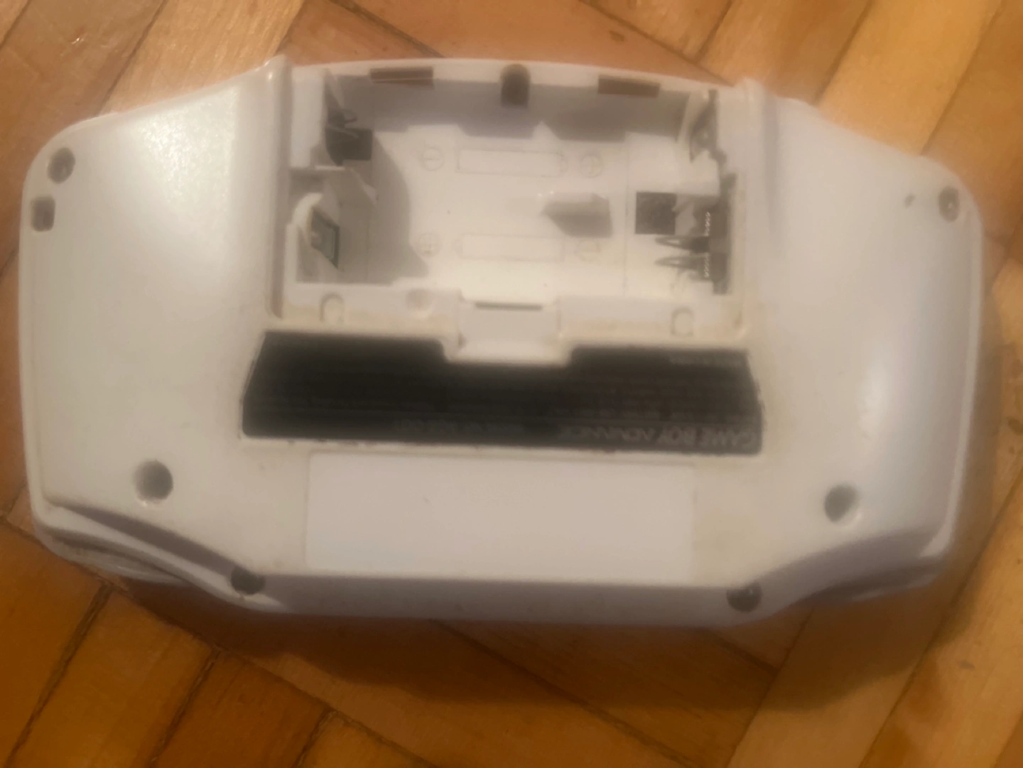White Game Boy Advance SP. Used condition. Screen and buttons appear to be in working order. Battery compartment is visible. No games or accessories included.