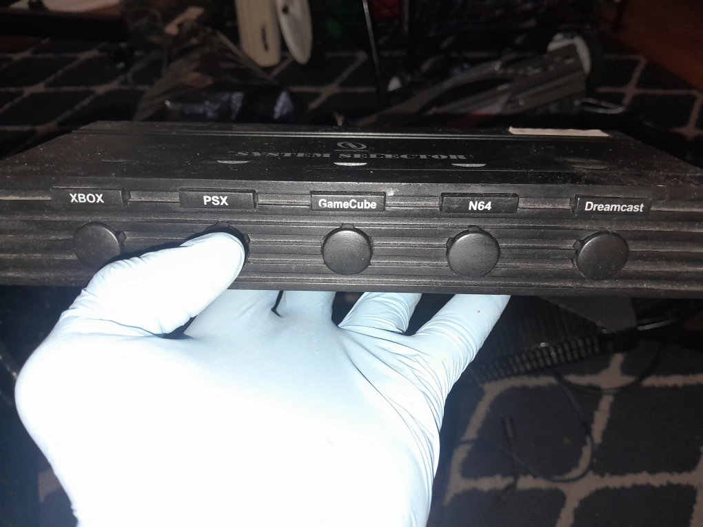 Used Interface brand system selector. Works with five consoles: Xbox, PSX, GameCube, N64, and Dreamcast. Black plastic. Shows some wear.