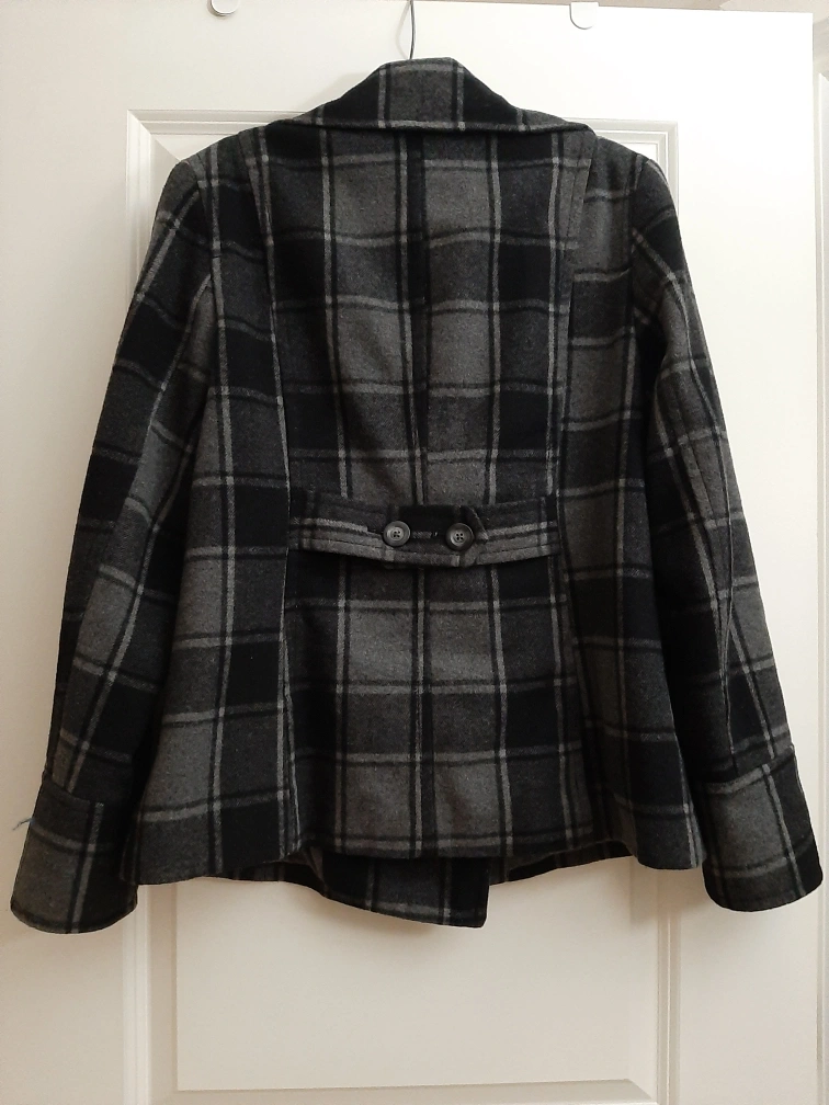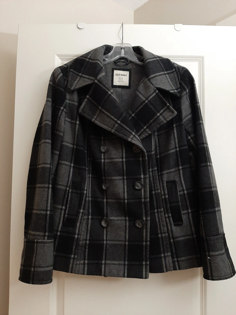 Women's peacoat. Double-breasted. Grey and black plaid pattern. Size L/G. Long sleeves. Fold-over cuffs. Patch pocket.