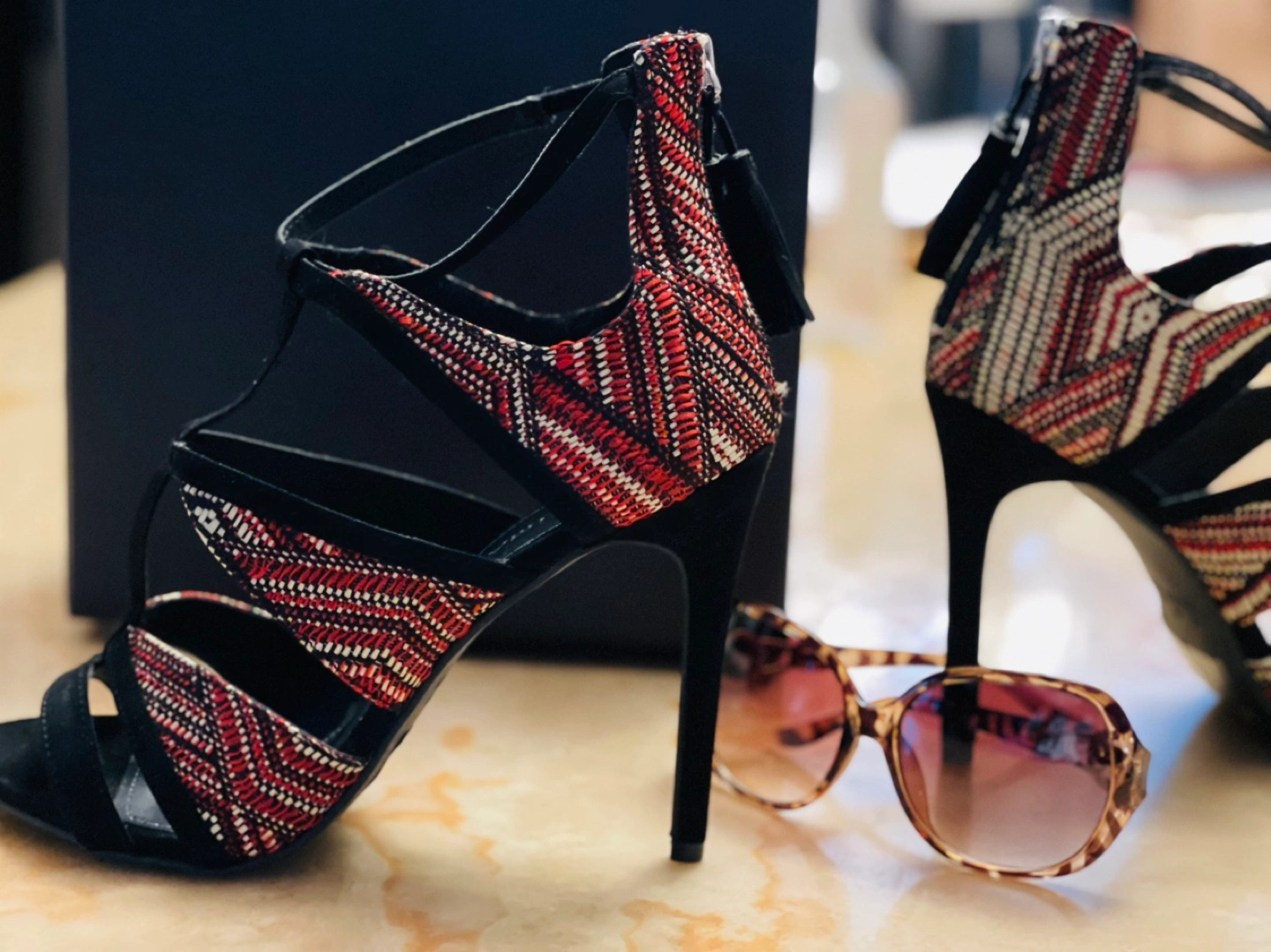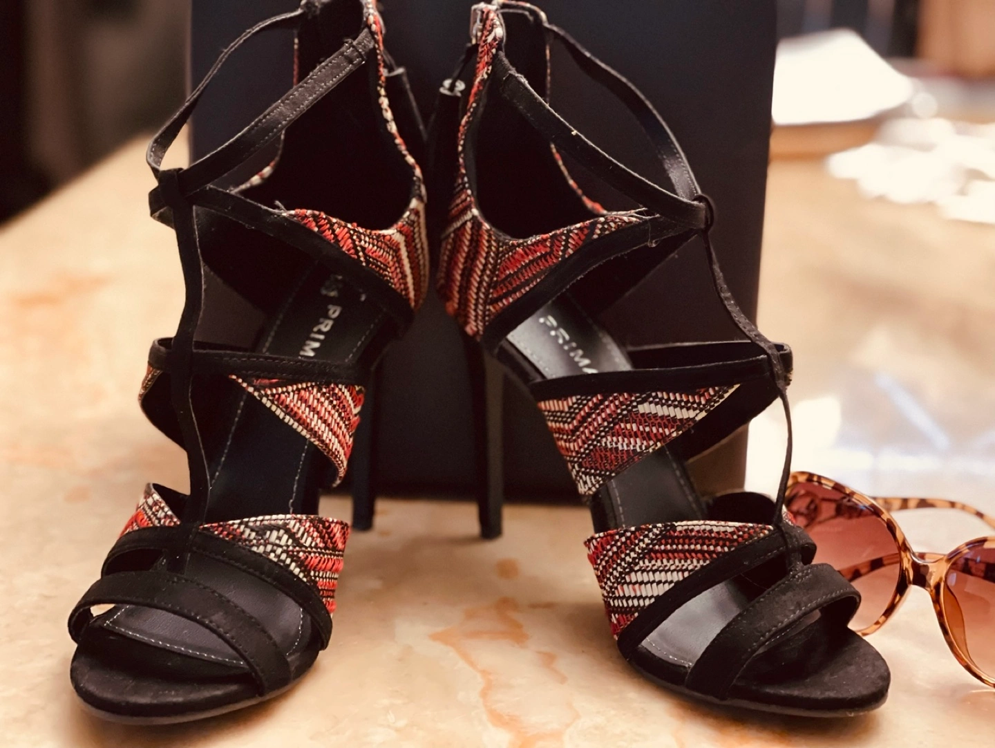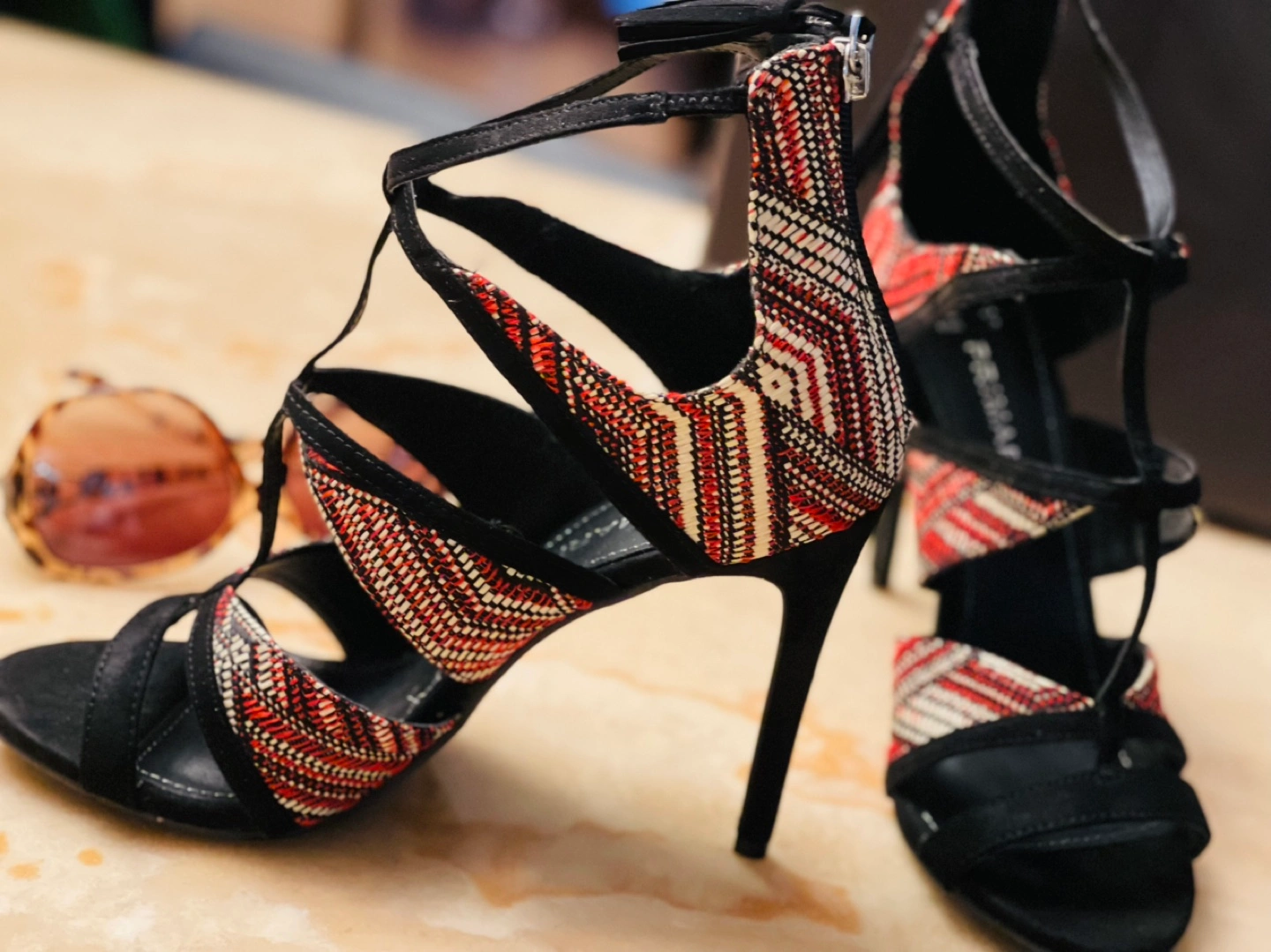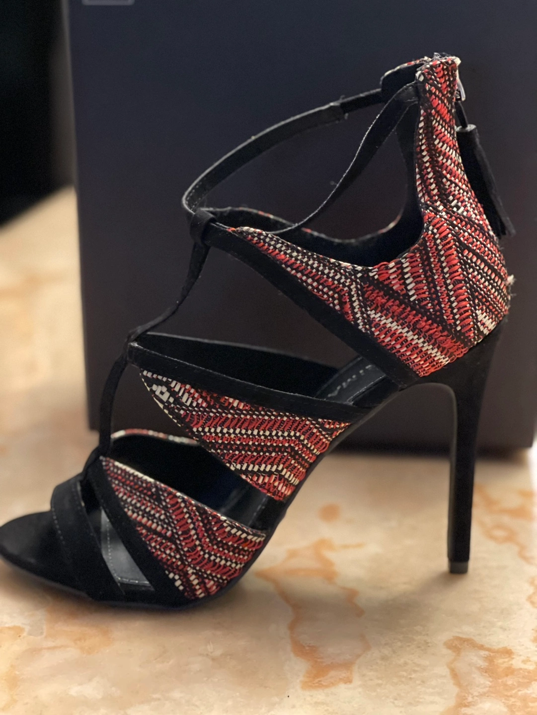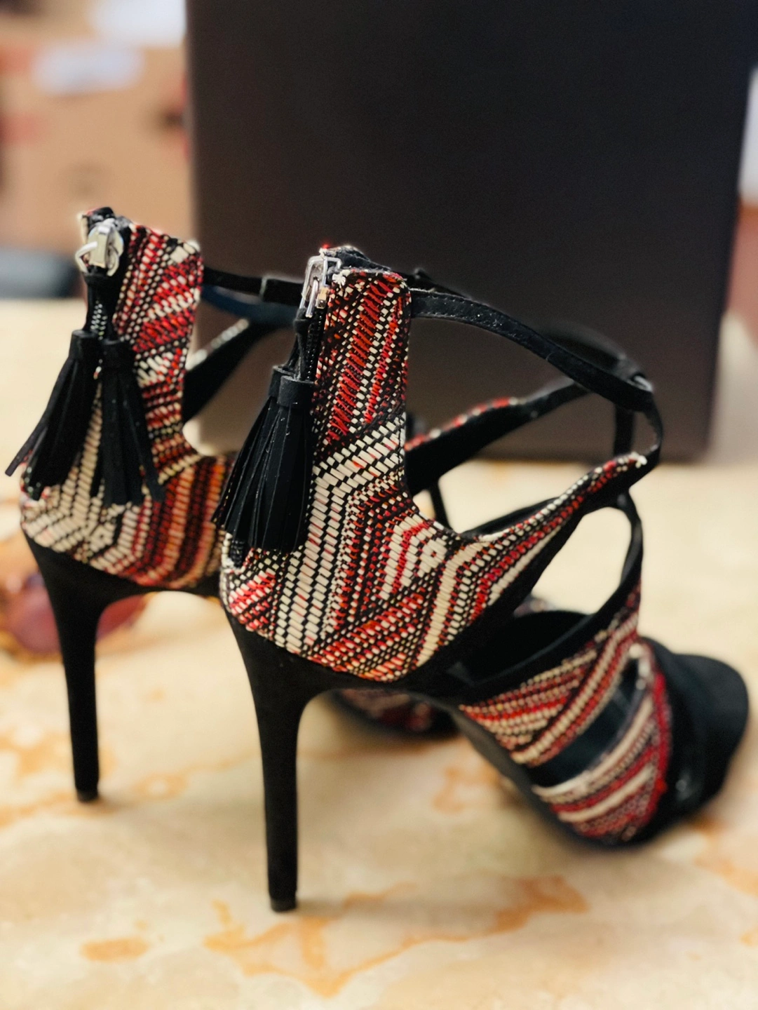 Women's high heels. Red, black and cream patterned fabric upper. Black suede-like heel and straps. Zip closure at back. Small tassels on back straps. Size UK 7, EUR 40, USA 8.