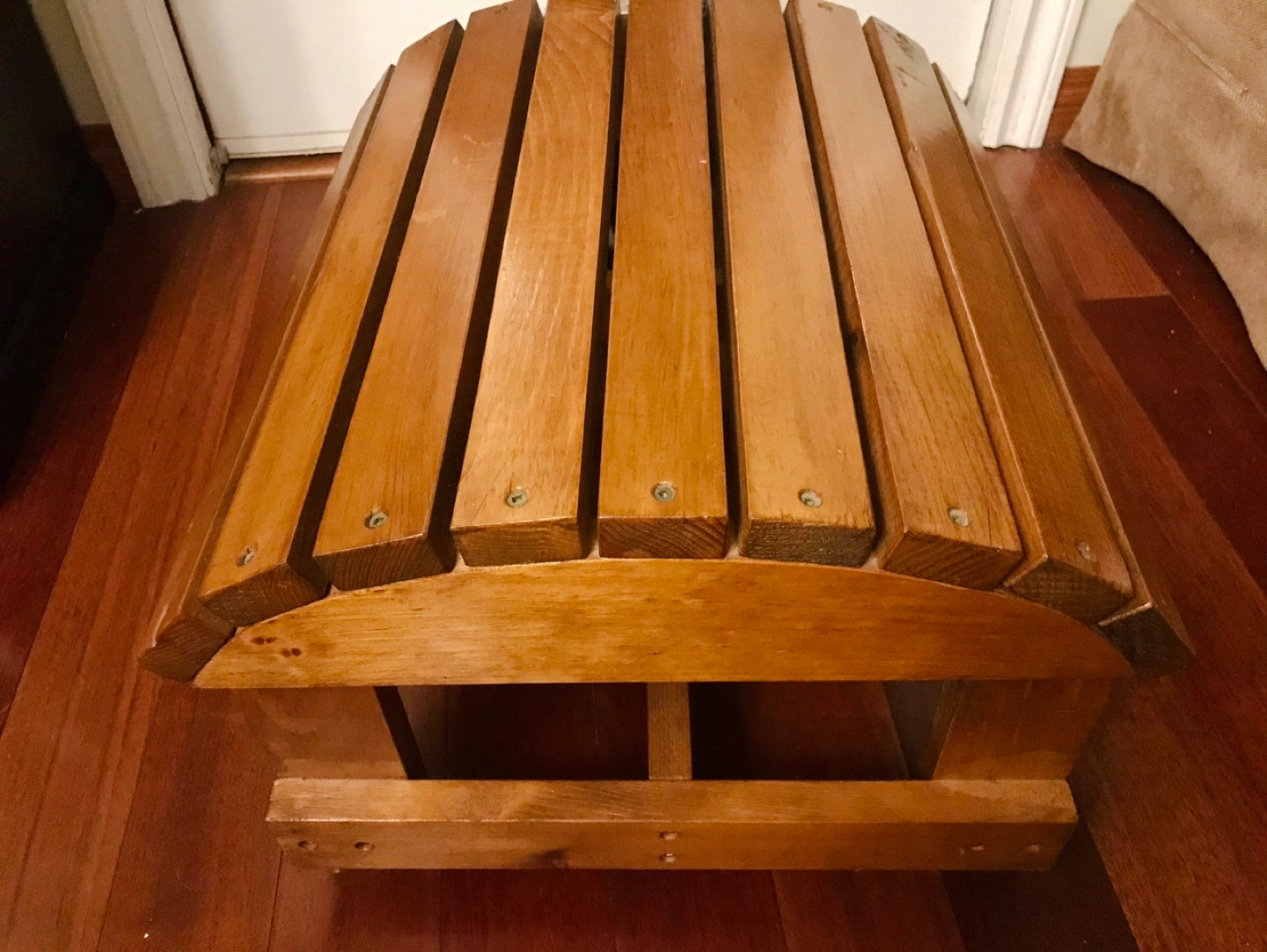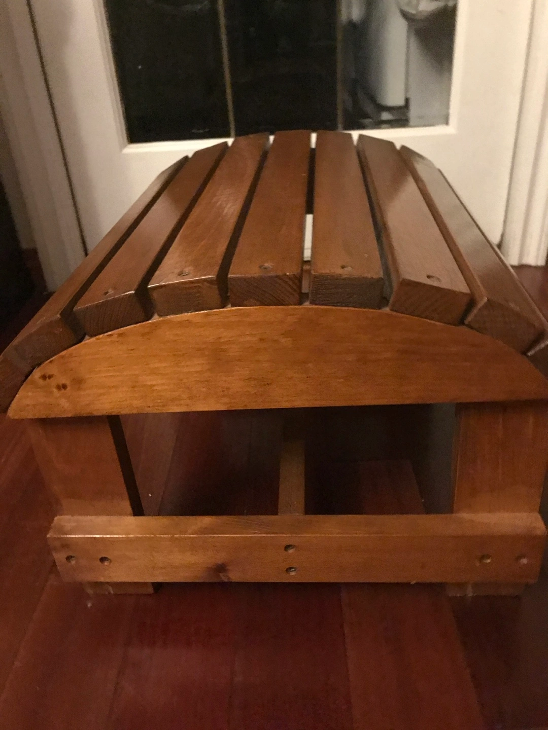 Small, wooden foot stool. Solid wood construction. Curved top. Simple design. Great for extra seating.