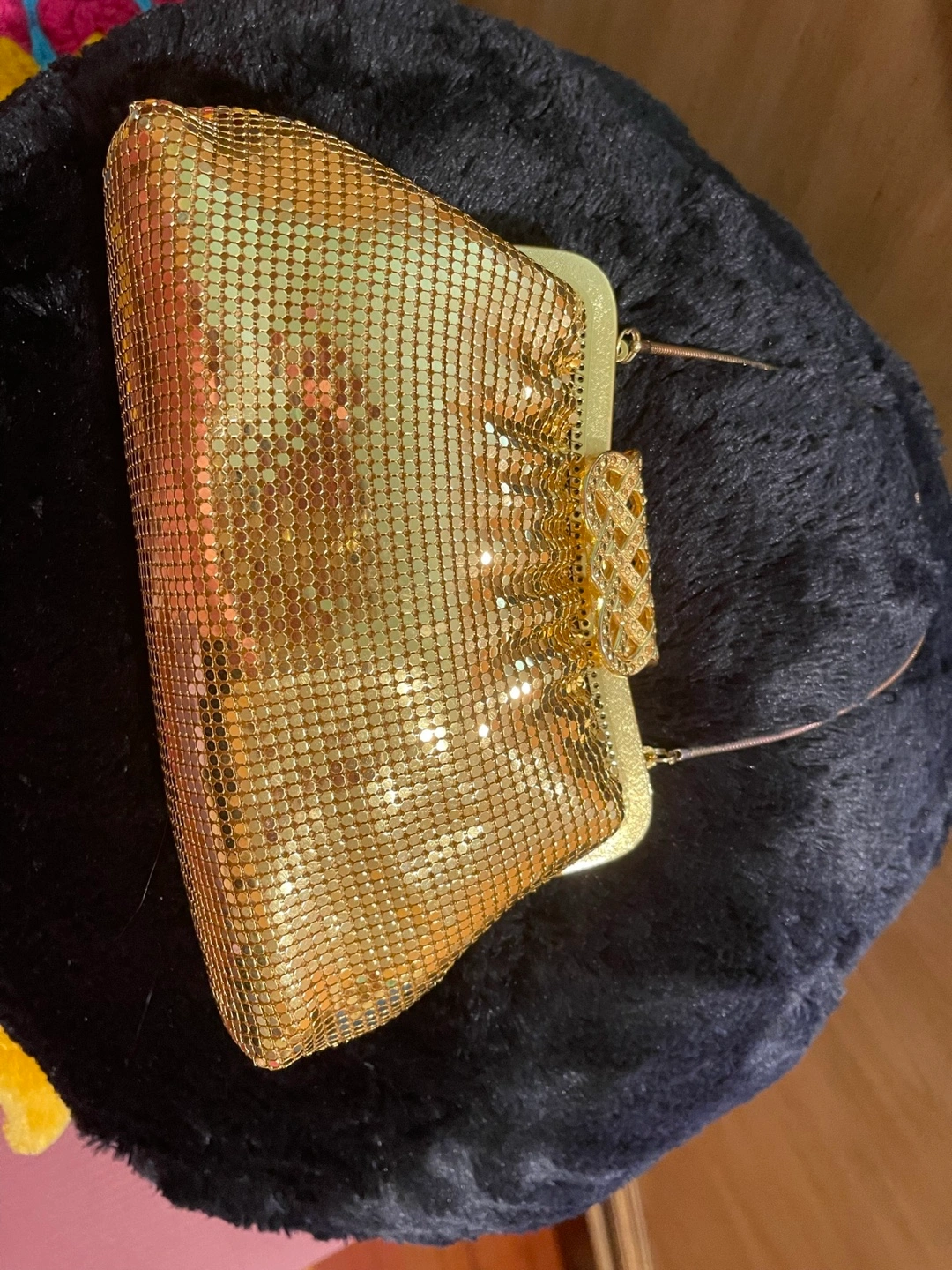 Gorgeous gold metallic mesh clutch. Features a decorative clasp and a chain strap. Perfect for a special occasion.