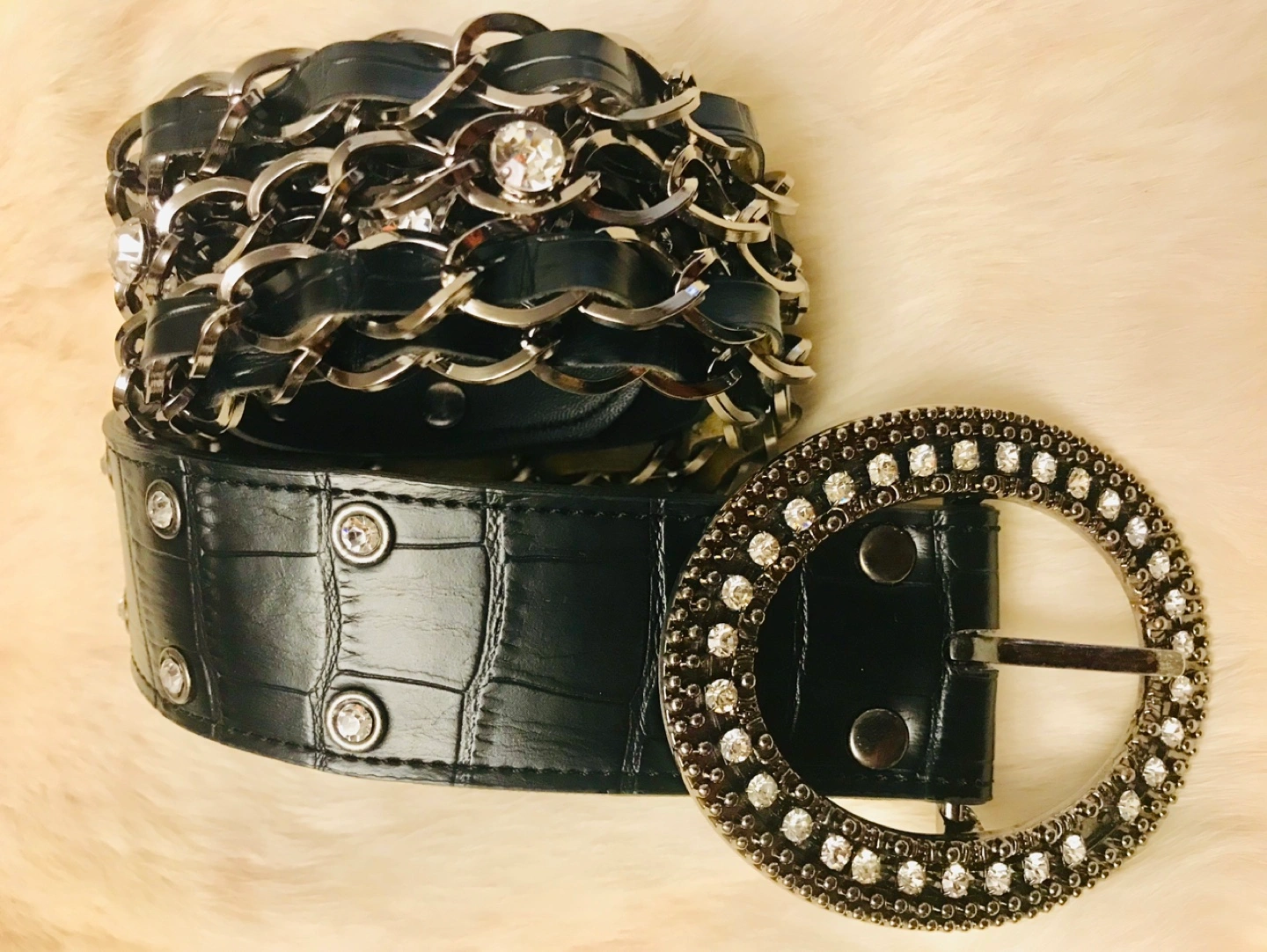 Stylish black leather belt. Features a ornate rhinestone buckle and a long chain detail. Crocodile-embossed leather. Perfect for adding a touch of glamour to any outfit.