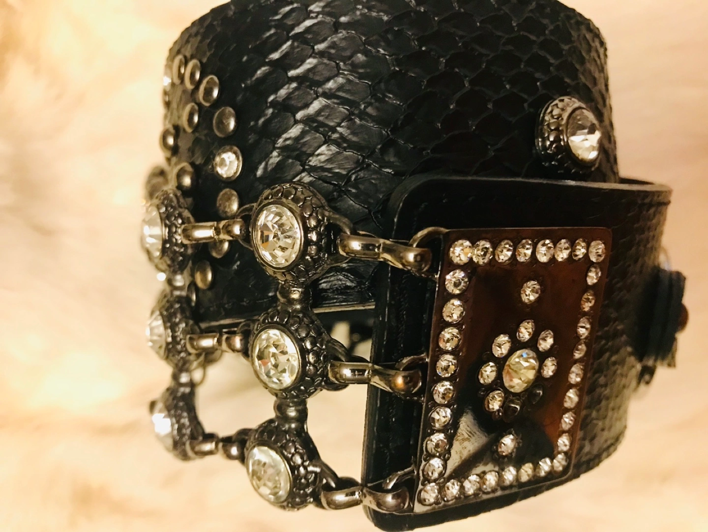 143Beautiful black leather belt. Features rhinestone embellishments and metal accents. Unique design, great for adding flair to any outfit.