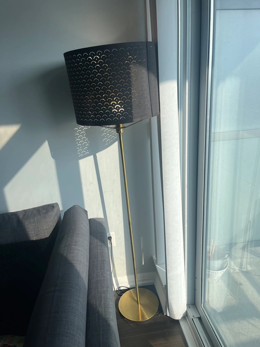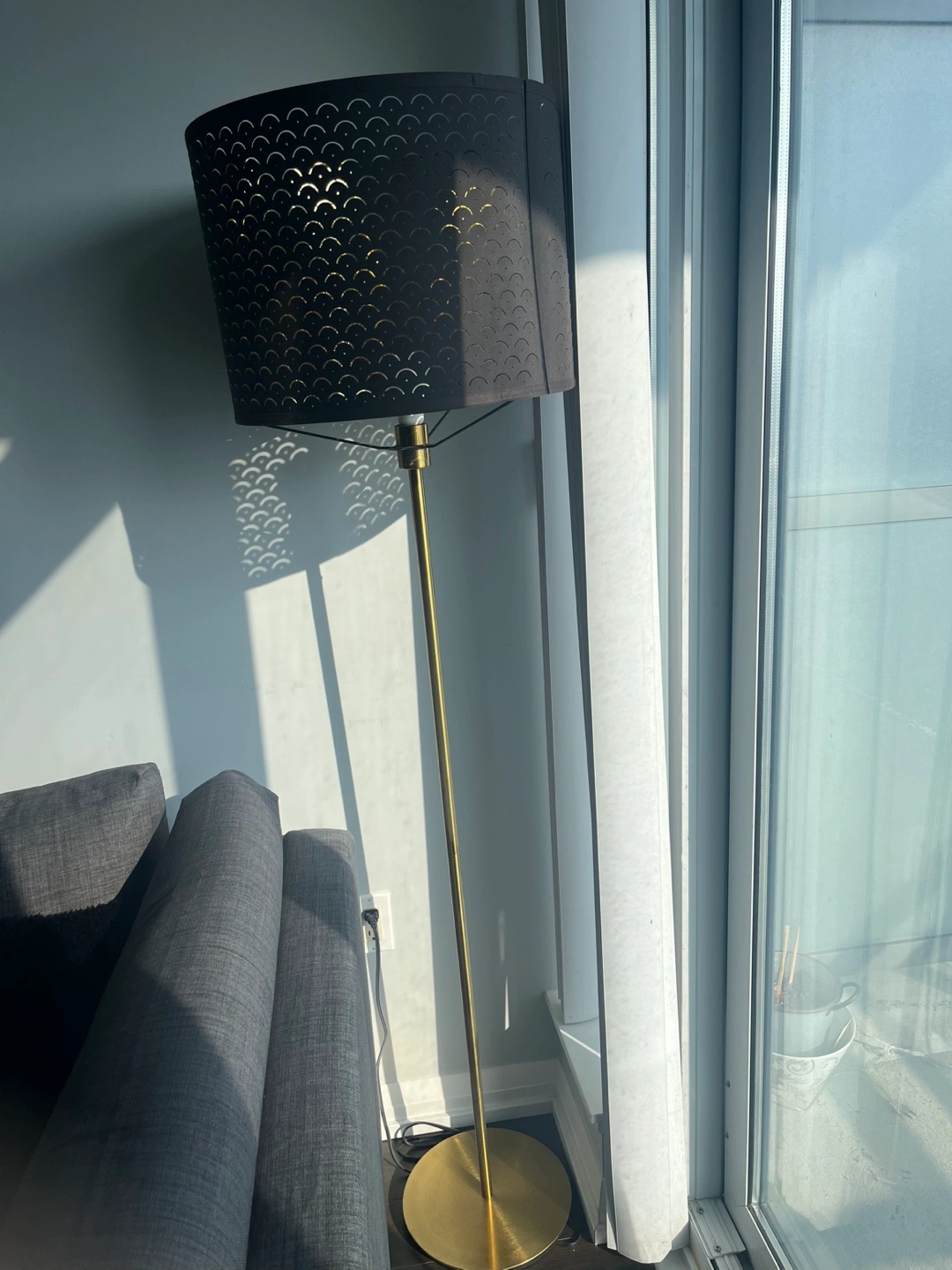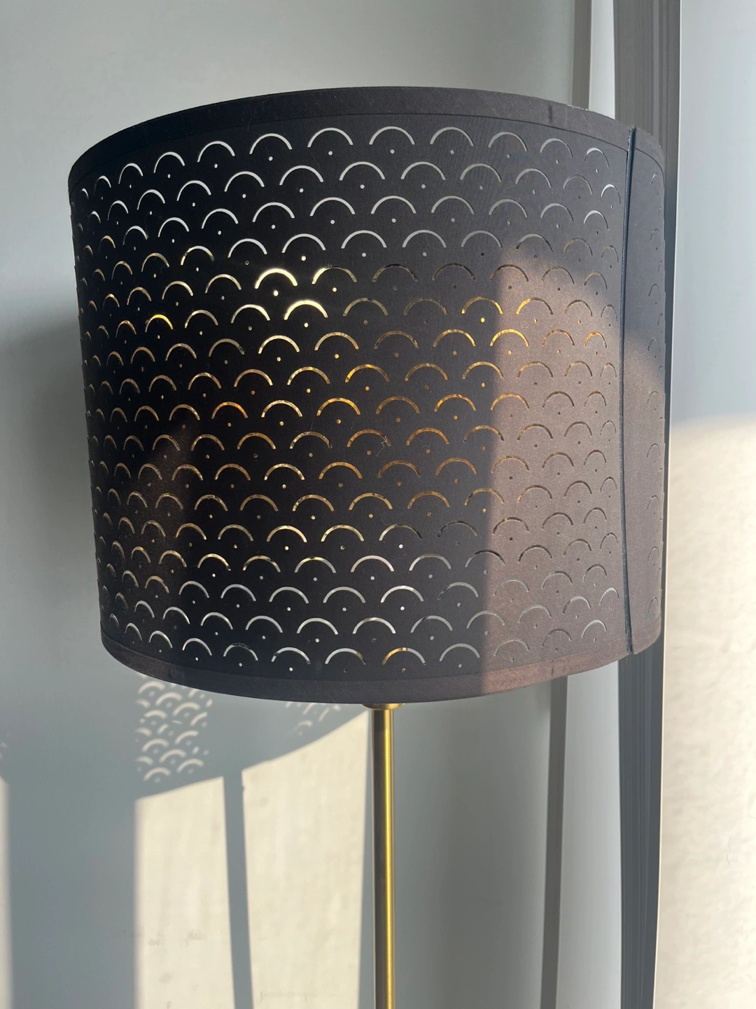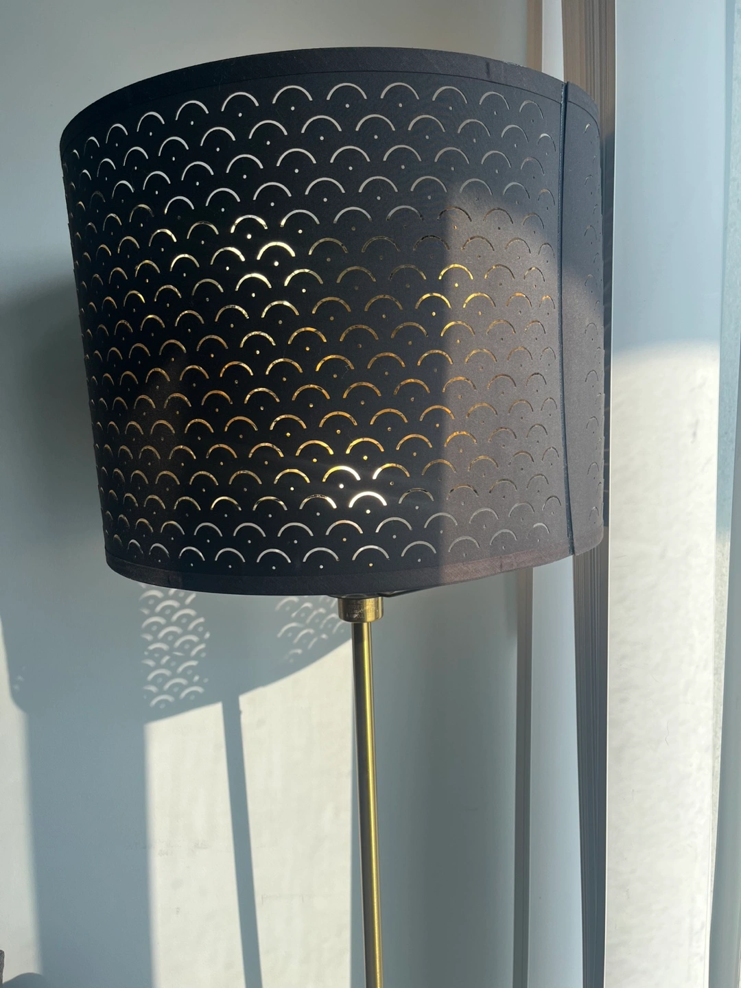 Tall floor lamp. Gold-coloured metal stand. Black fabric shade with a repeating cutout pattern. Includes remote control for light adjustment. Can change light from warm to cold colour.