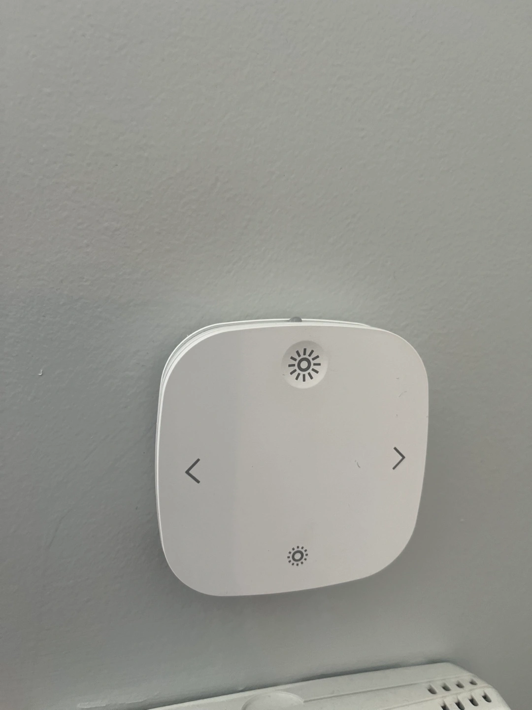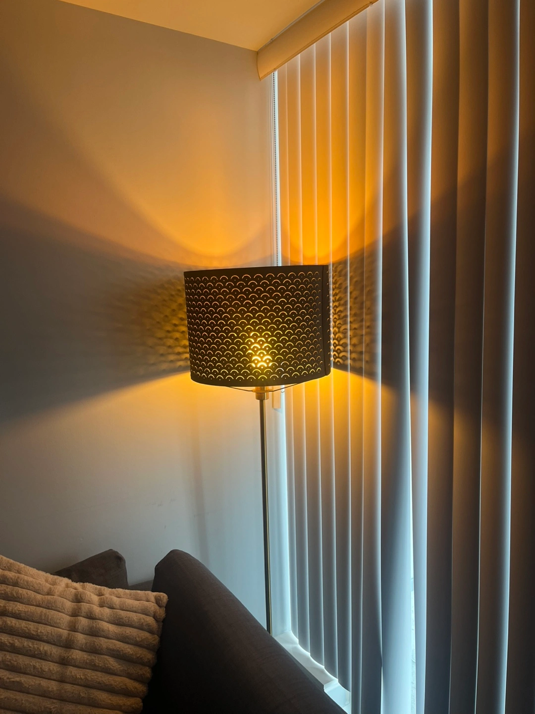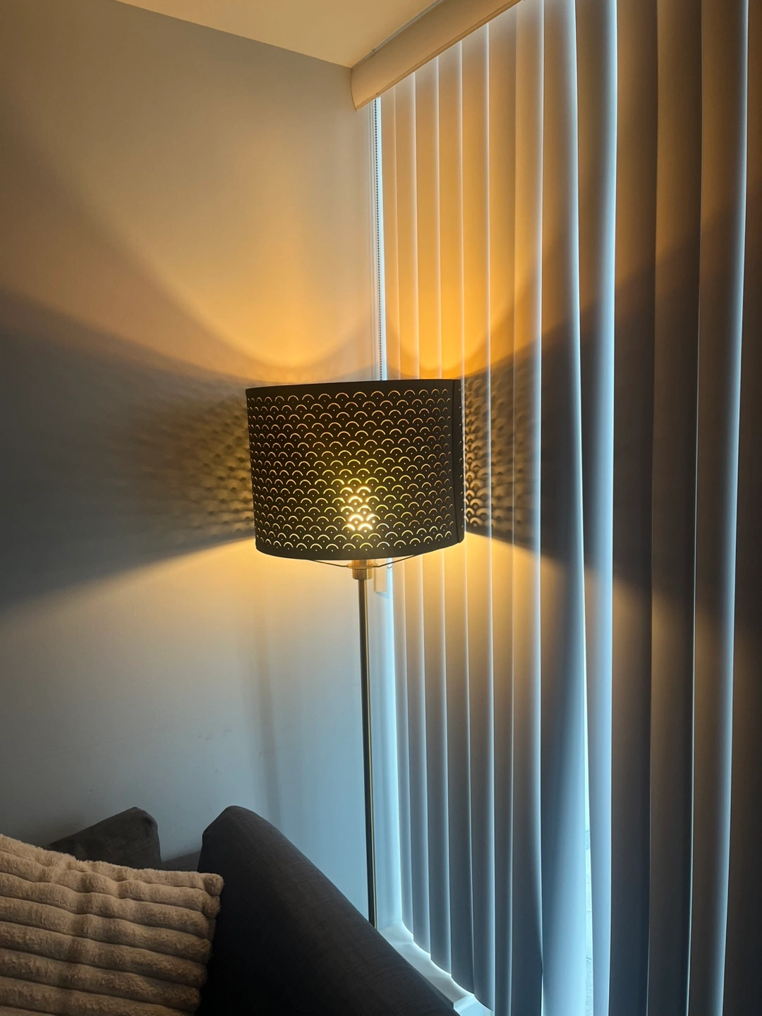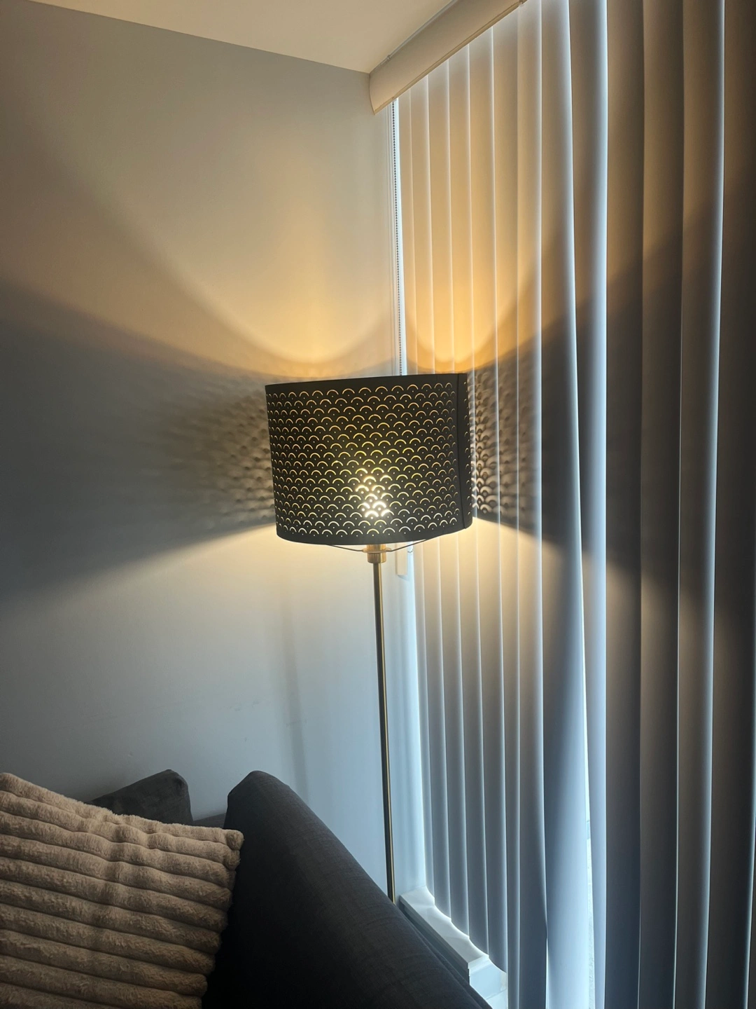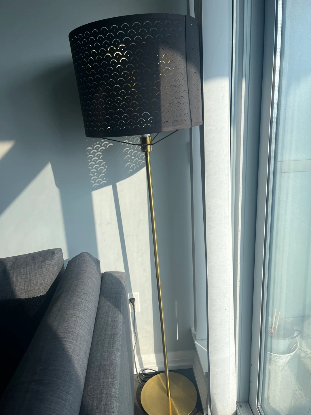 Tall floor lamp. Gold-coloured metal stand. Black fabric shade with a repeating cutout pattern. Includes remote control for light adjustment. Can change light from warm to cold colour.
