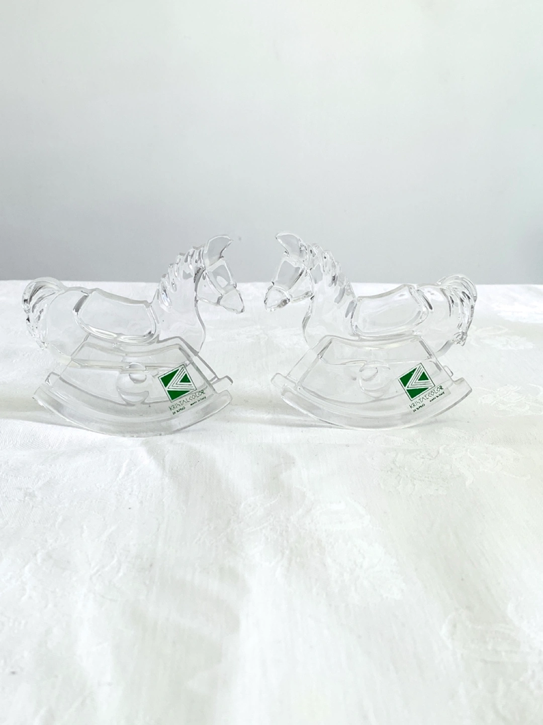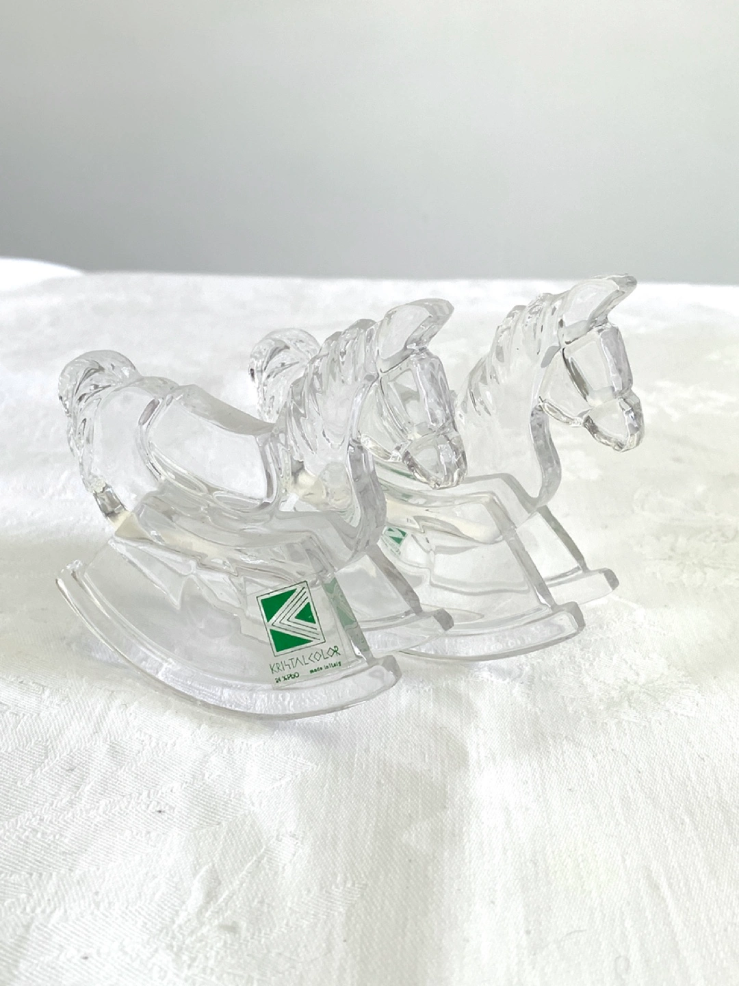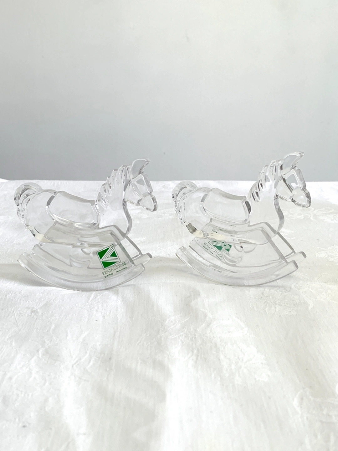 Two lovely crystal rocking horse figurines. Clear glass. Collectible pair perfect for equestrians and animal lovers. Made in Italy.