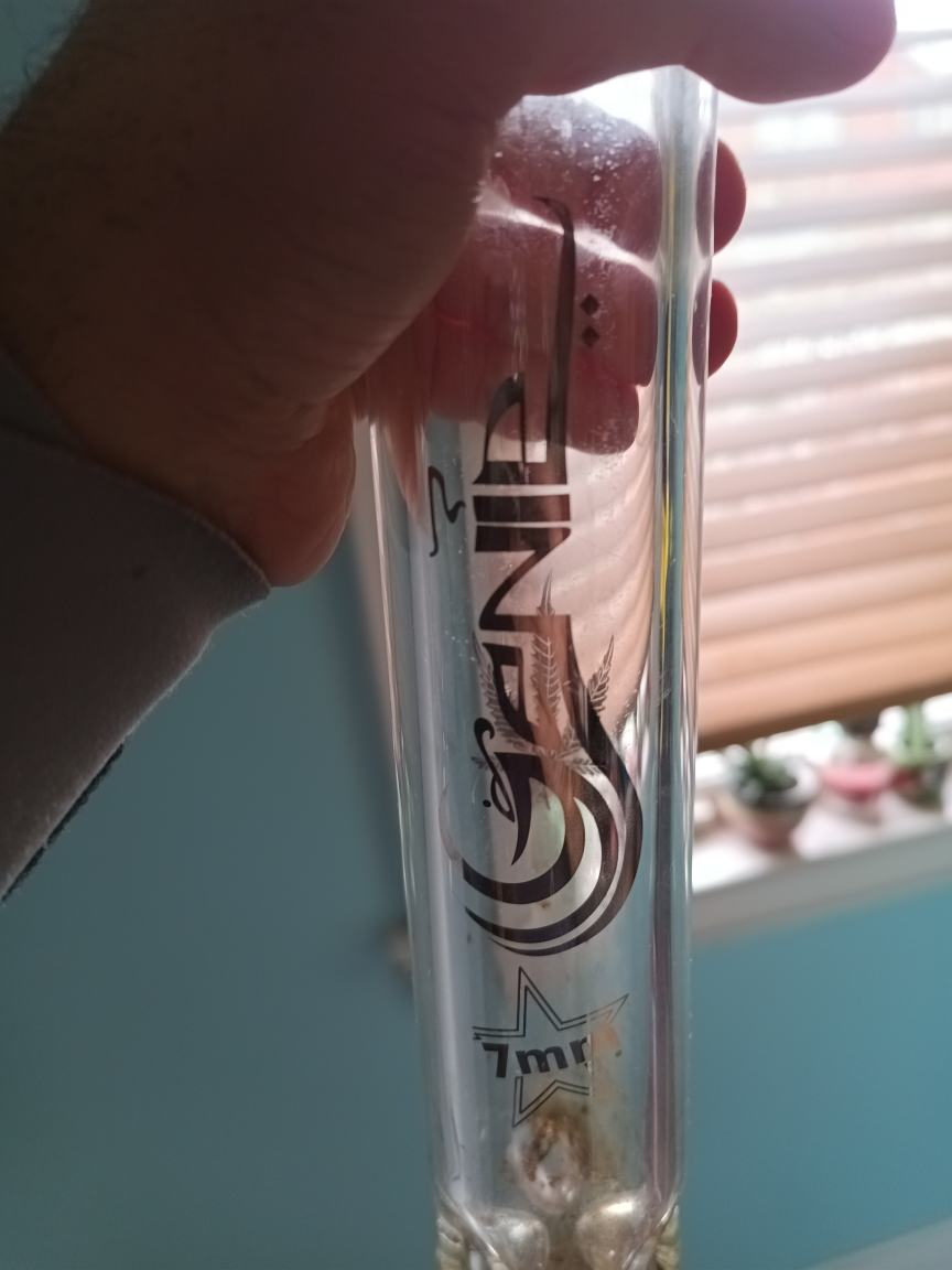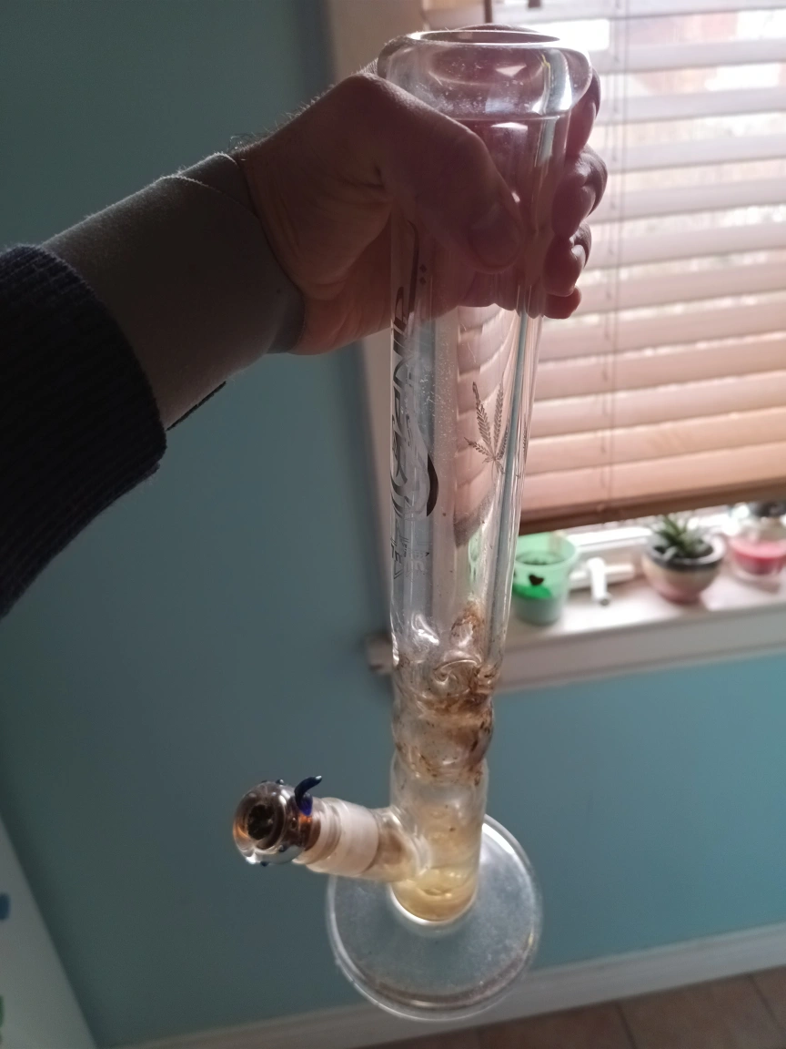 Large glass bong. Used condition. Features a unique design and a cannabis leaf graphic. Shows some residue.